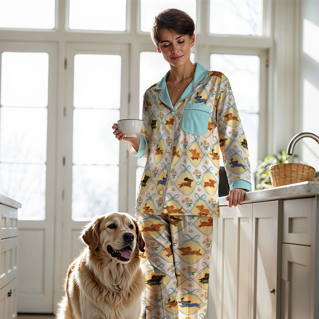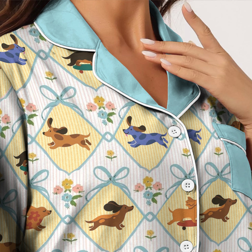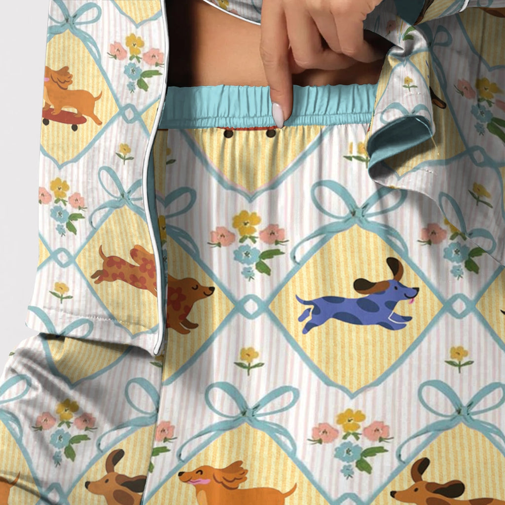Wrap yourself in comfort with this playful and pastel-toned sleepwear, where adorable dachshunds peek out of ribbon-tied frames surrounded by cheerful florals. This sweet, pet-themed pattern not only adds a whimsical charm to your outfit but also brings a sense of coziness, joy, and gentle nostalgia. Made from soft, lightweight fabric, this is the perfect choice for anyone who loves dogs and wants to carry their playful spirit into their dreams.