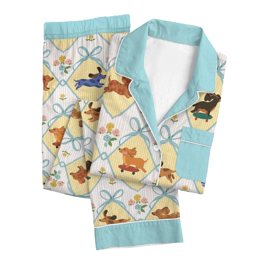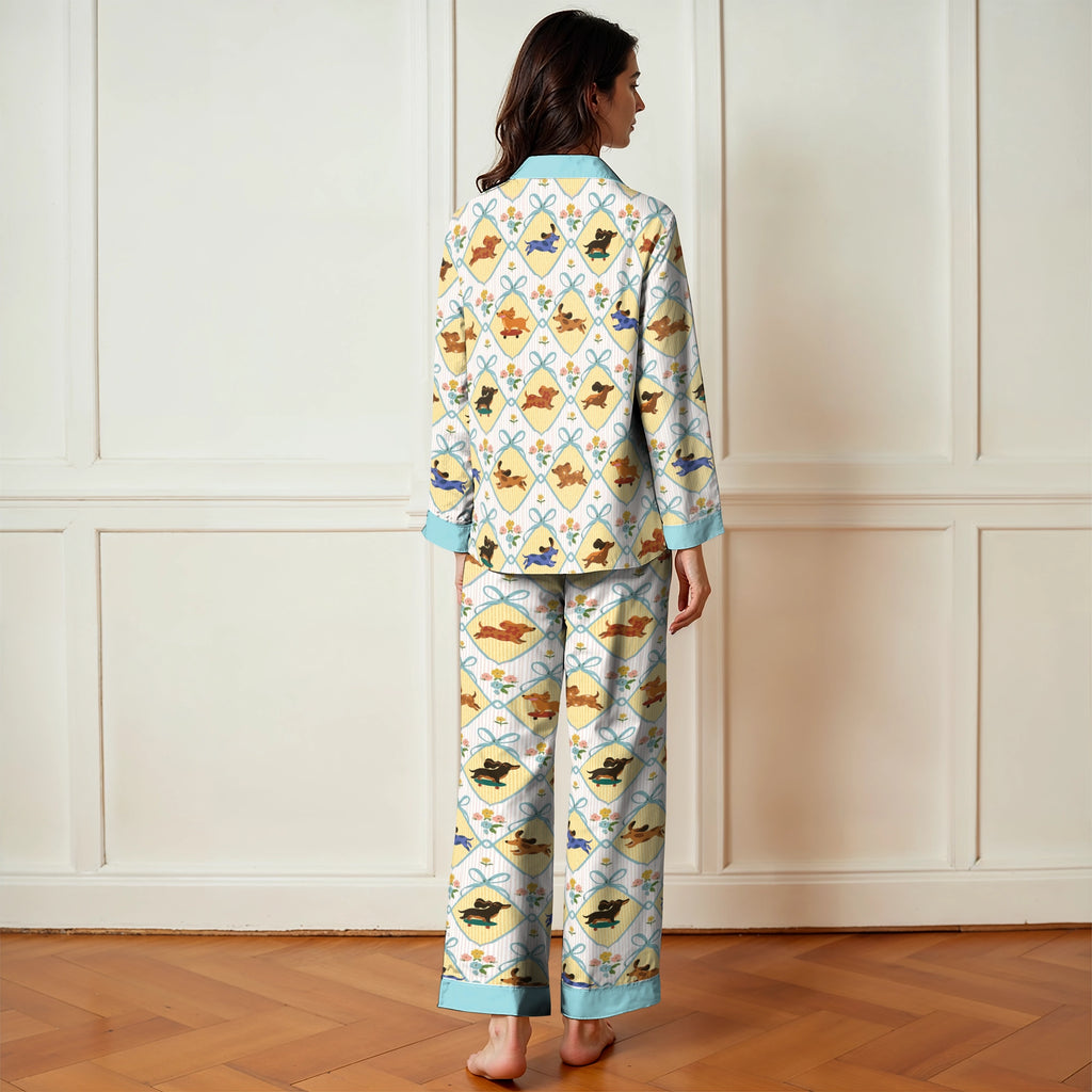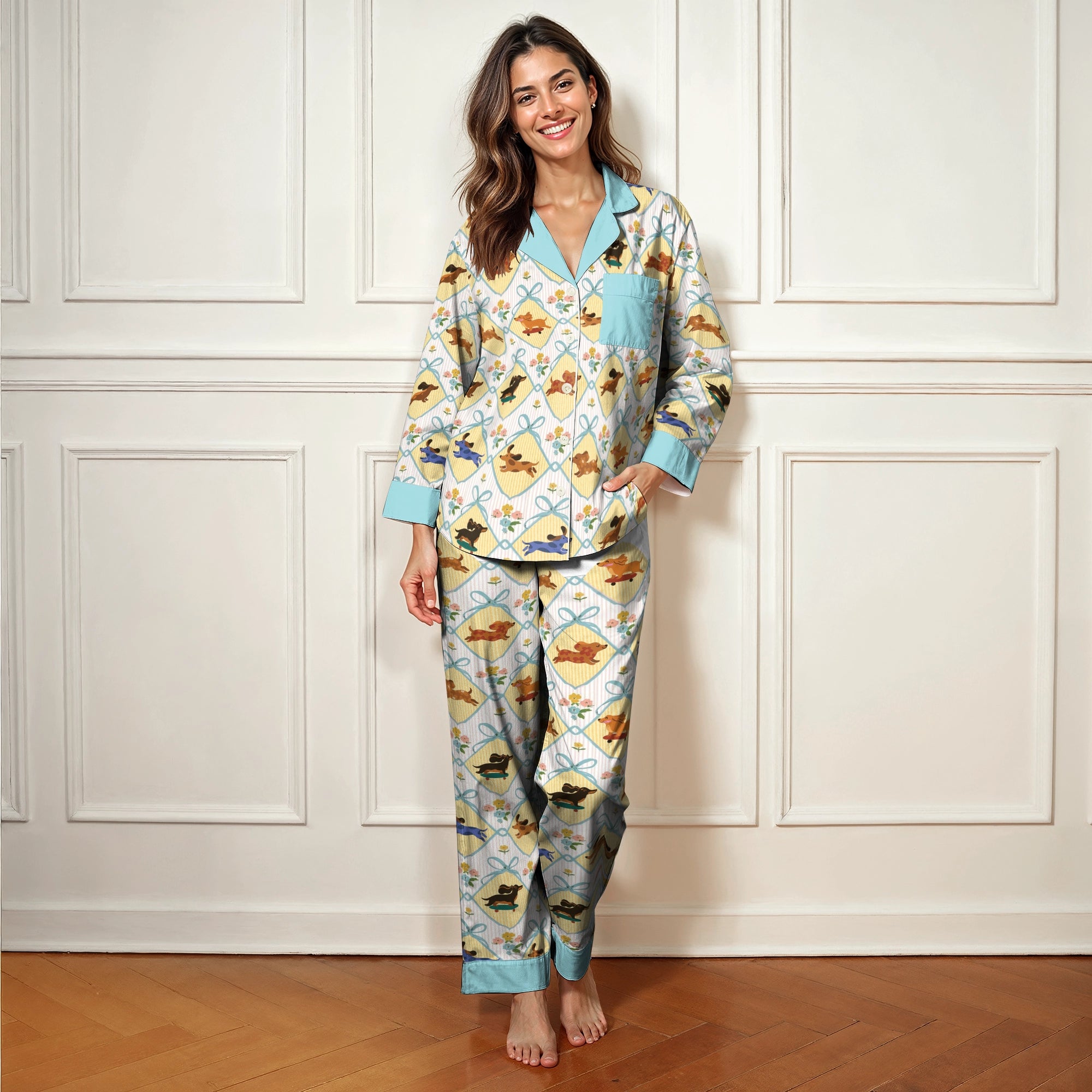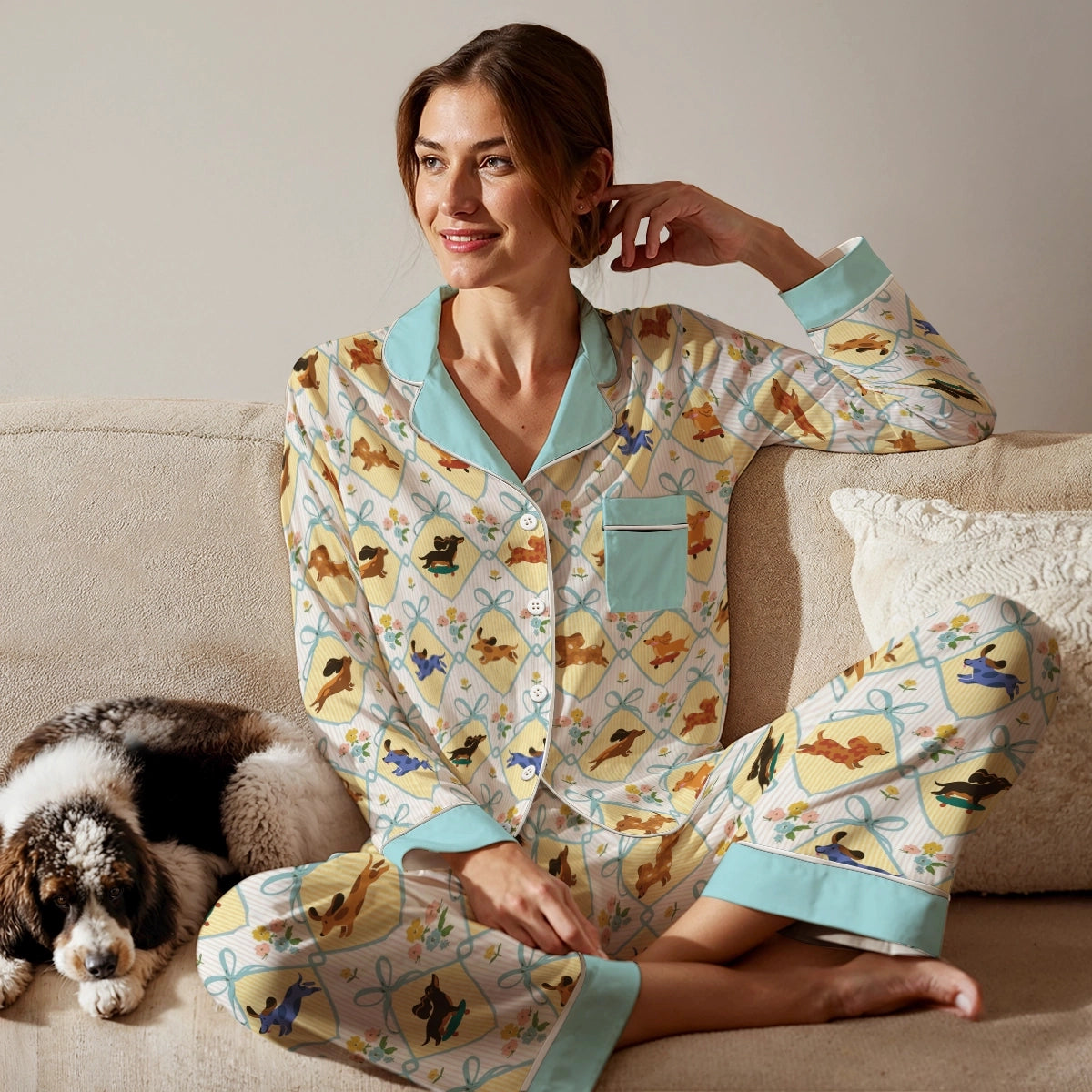Wrap yourself in comfort with this playful and pastel-toned sleepwear, where adorable dachshunds peek out of ribbon-tied frames surrounded by cheerful florals. This sweet, pet-themed pattern not only adds a whimsical charm to your outfit but also brings a sense of coziness, joy, and gentle nostalgia. Made from soft, lightweight fabric, this is the perfect choice for anyone who loves dogs and wants to carry their playful spirit into their dreams.
