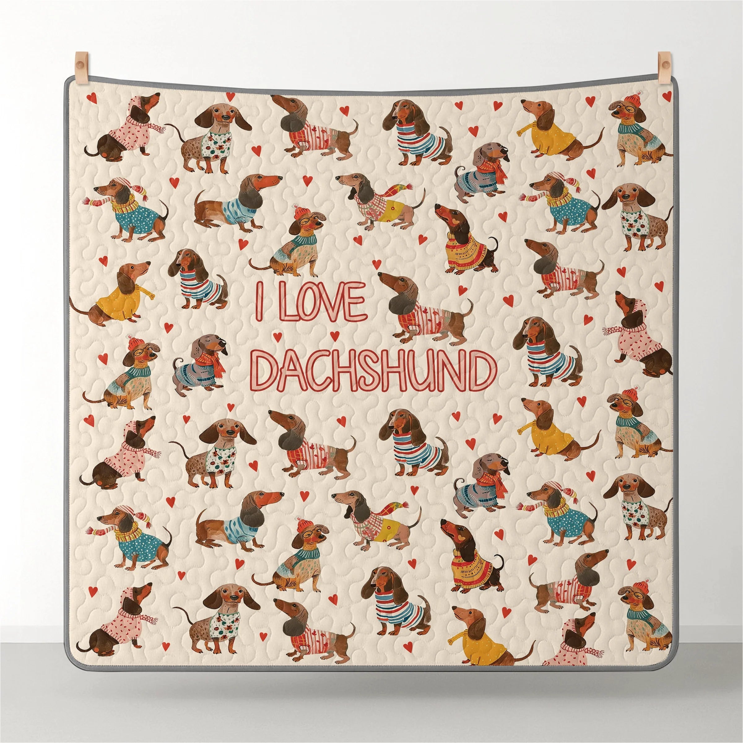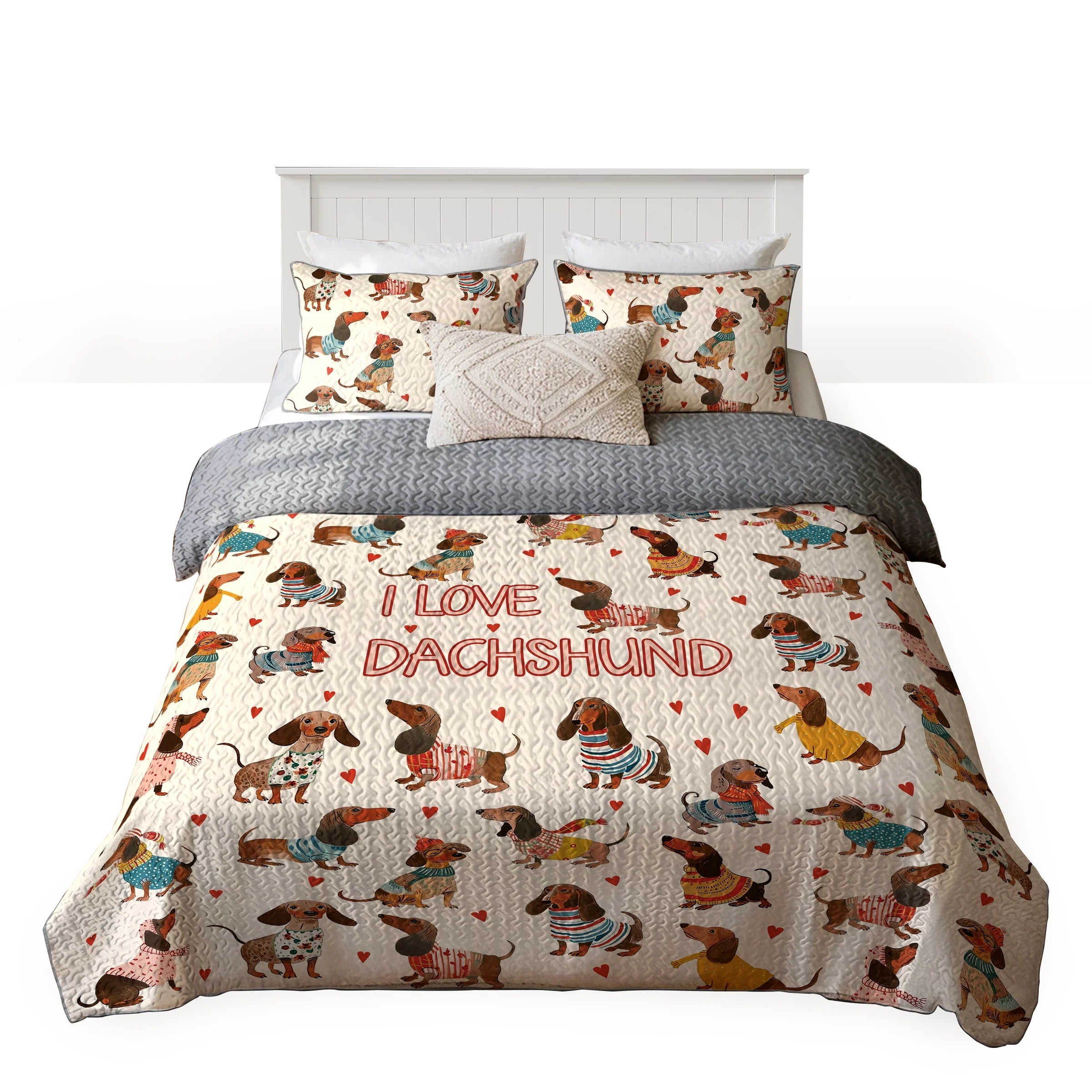Wrap yourself in comfort with this dachshund lover statement-themed quilt set, where dachshunds illustrated in cute outfits and playful poses arranged across a warm beige background with heart accents with red, teal, yellow, and earthy tones and striped sweaters, floral dresses, and cheerful lettering not only add charm to your bedroom but also bring a sense of affection, playfulness, and cheerful charm. Made from soft, lightweight fabric, this is the perfect choice for anyone who loves dachshunds and wants to feel connected to their furry friend even in their dreams.
