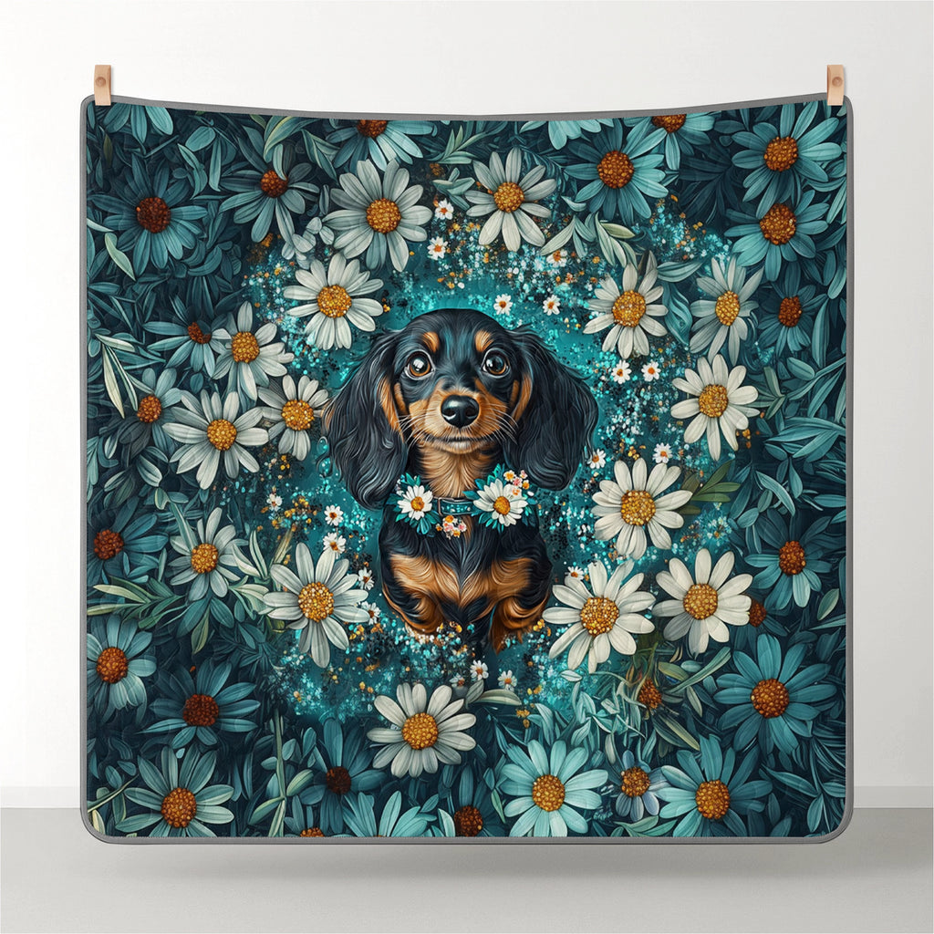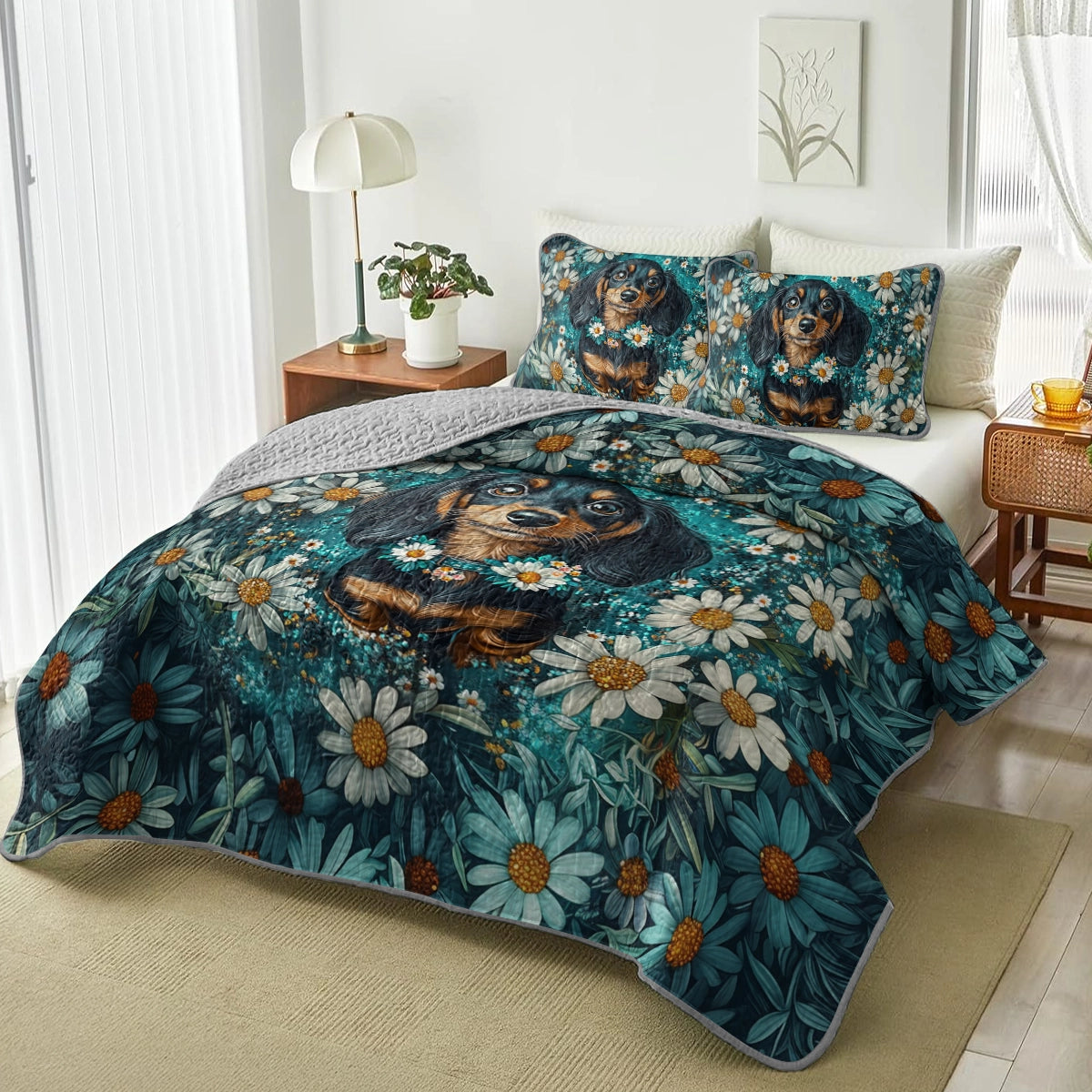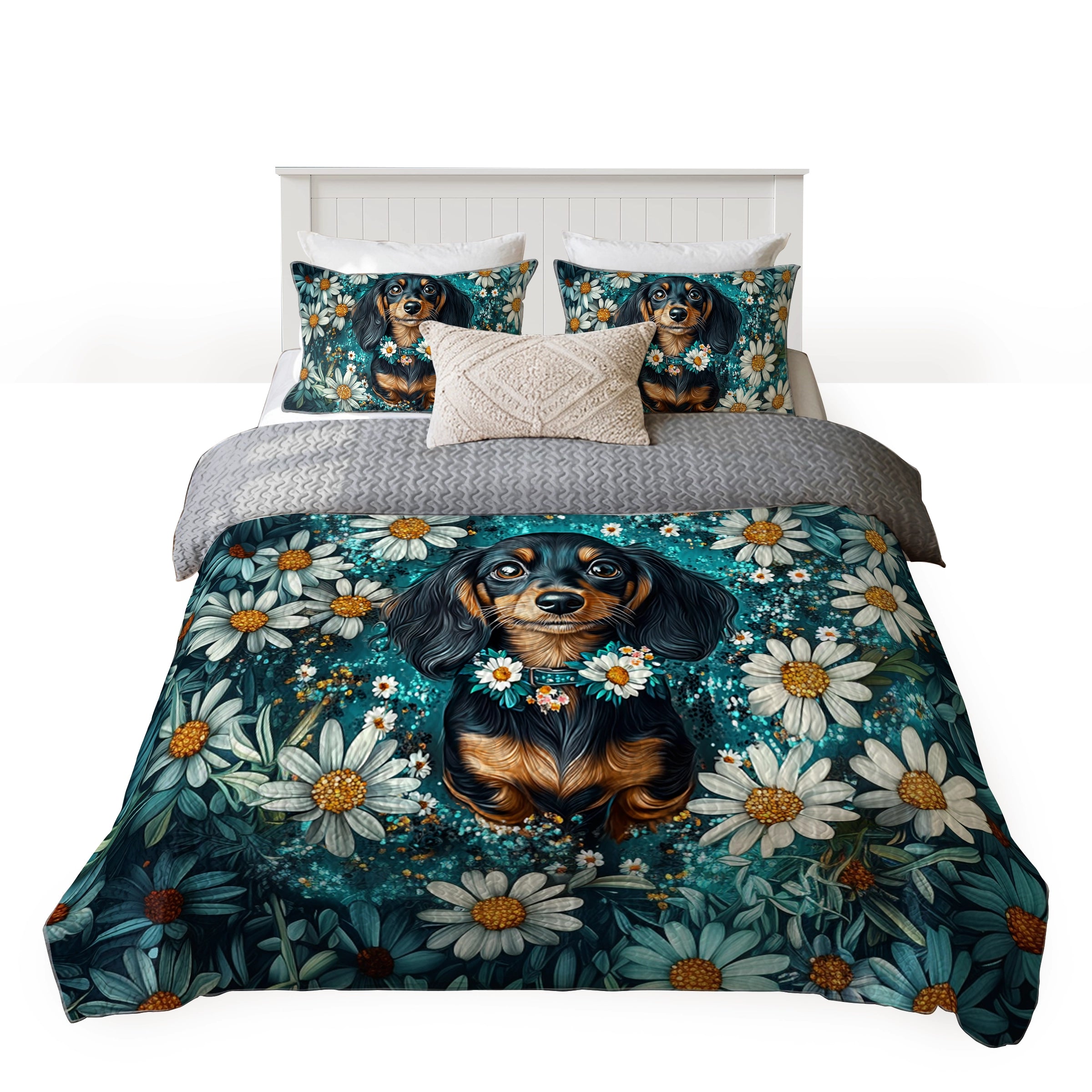 Wrap yourself in comfort with this daisy garden dachshund-themed quilt set, where dachshunds beautifully painted in realistic floral portrait style sitting serenely among blooming white daisies with teal greens, soft whites, and golden yellow accents and detailed petals, glowing highlights, and dreamy composition not only add charm to your bedroom but also bring a sense of elegance, gentleness, and floral serenity. Made from soft, lightweight fabric, this is the perfect choice for anyone who loves dachshunds and wants to feel connected to their furry friend even in their dreams.
