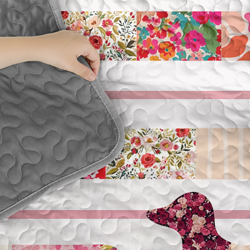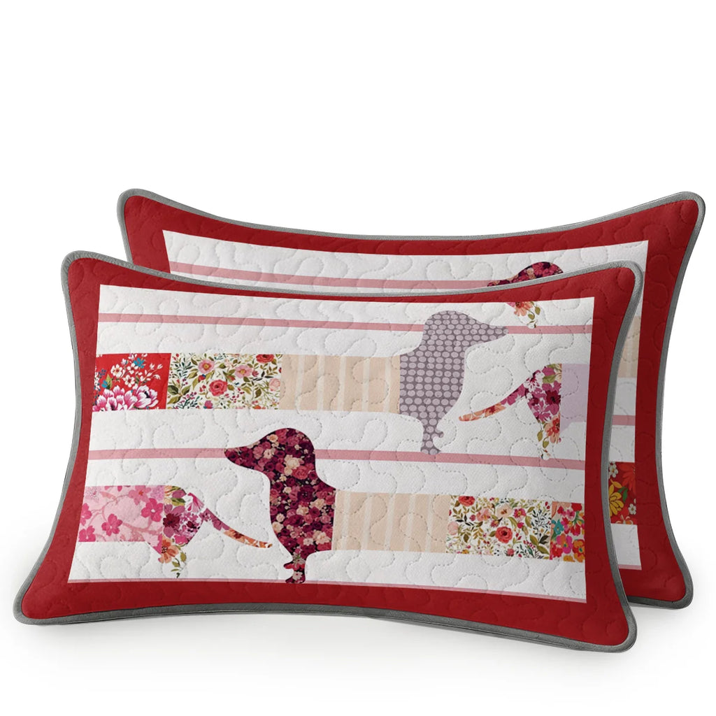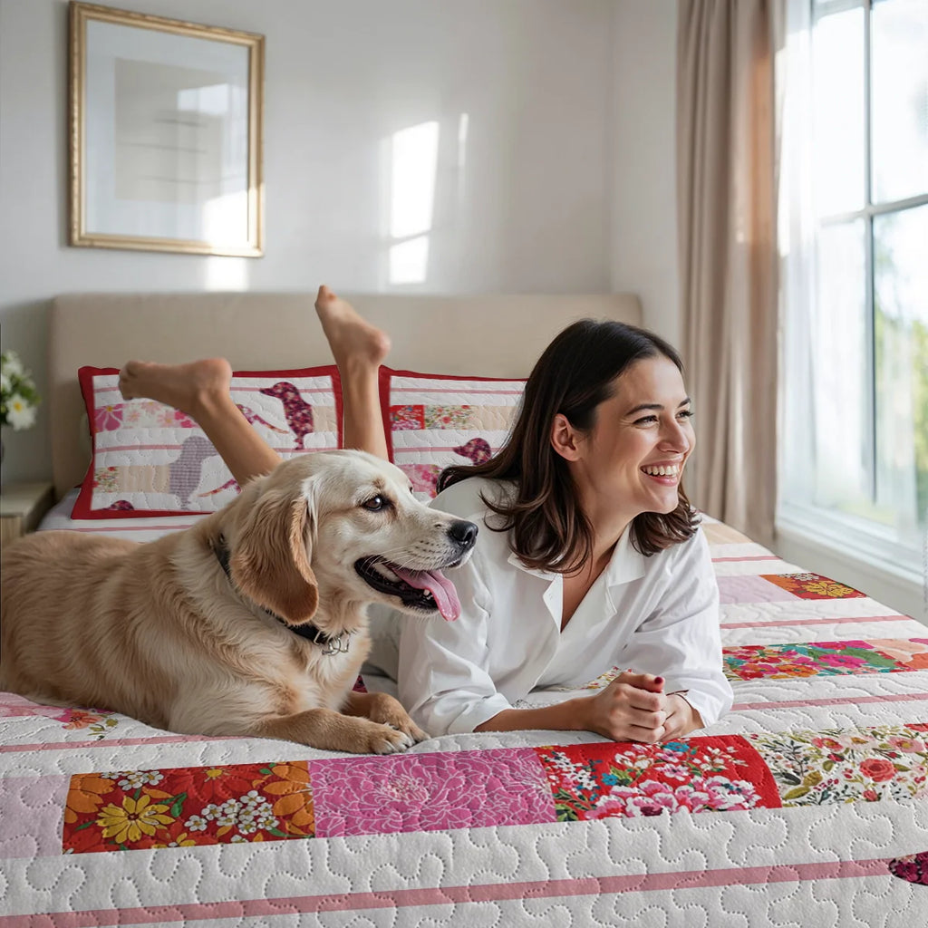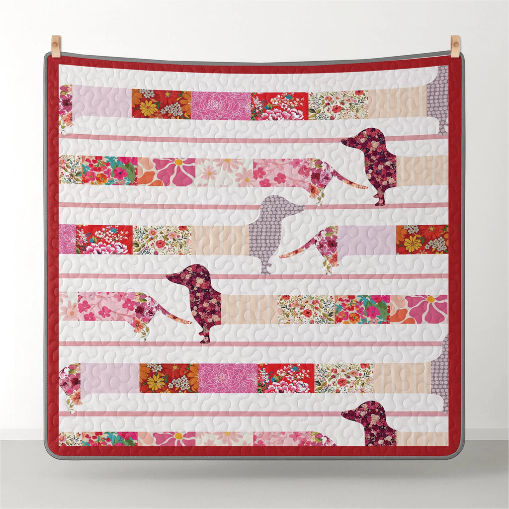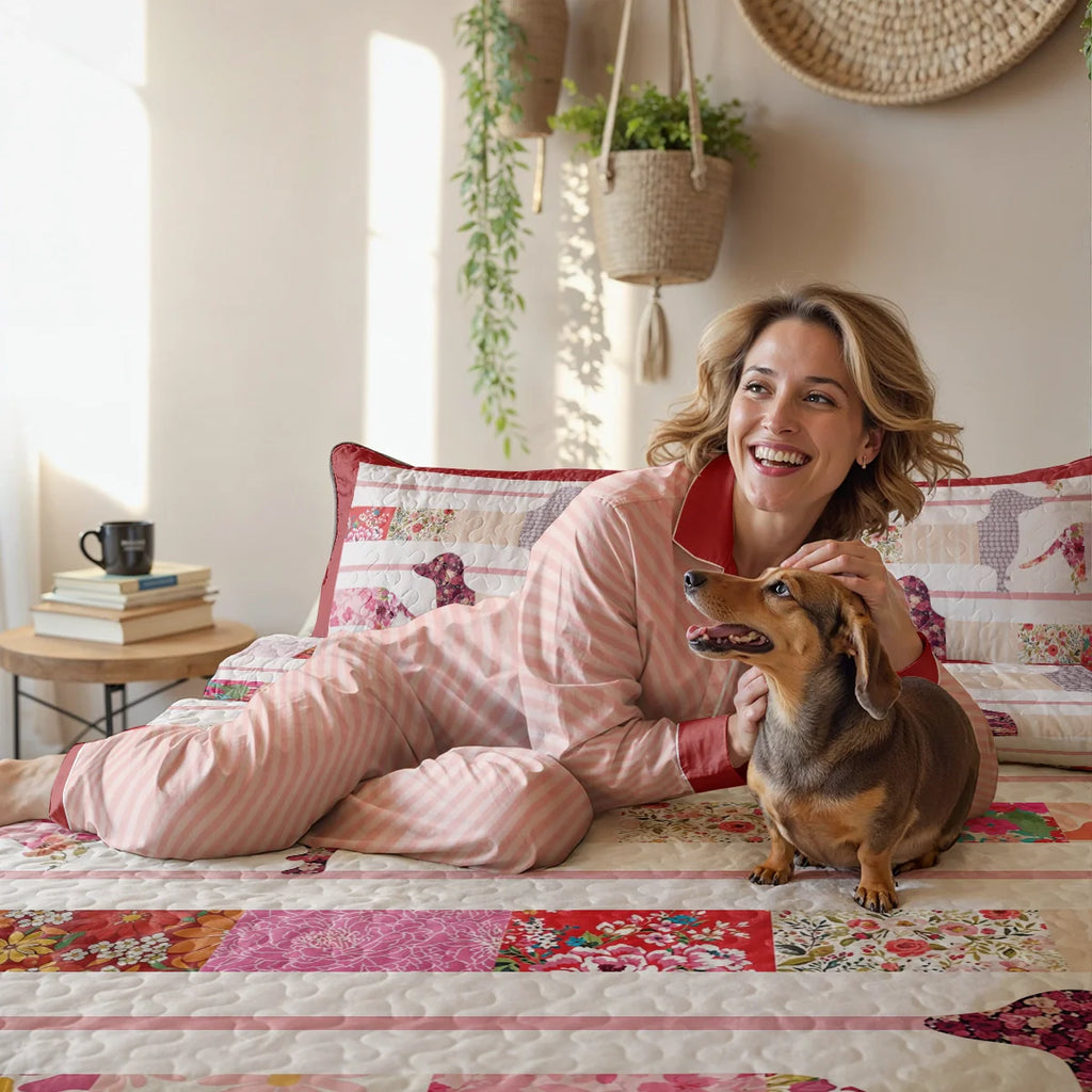 Wrap yourself in comfort with this floral patchwork dachshund-themed quilt set, where dachshunds crafted in floral fabric silhouettes laid out across horizontal white quilted stripes with red trim with rose red, cherry blossom pink, ivory, lavender, and garden florals and floral silhouettes, stripe layout, and contrasting red borders not only add charm to your bedroom but also bring a sense of cozy elegance, handmade charm, and vibrant femininity. Made from soft, lightweight fabric, this is the perfect choice for anyone who loves dachshunds and wants to feel connected to their furry friend even in their dreams.