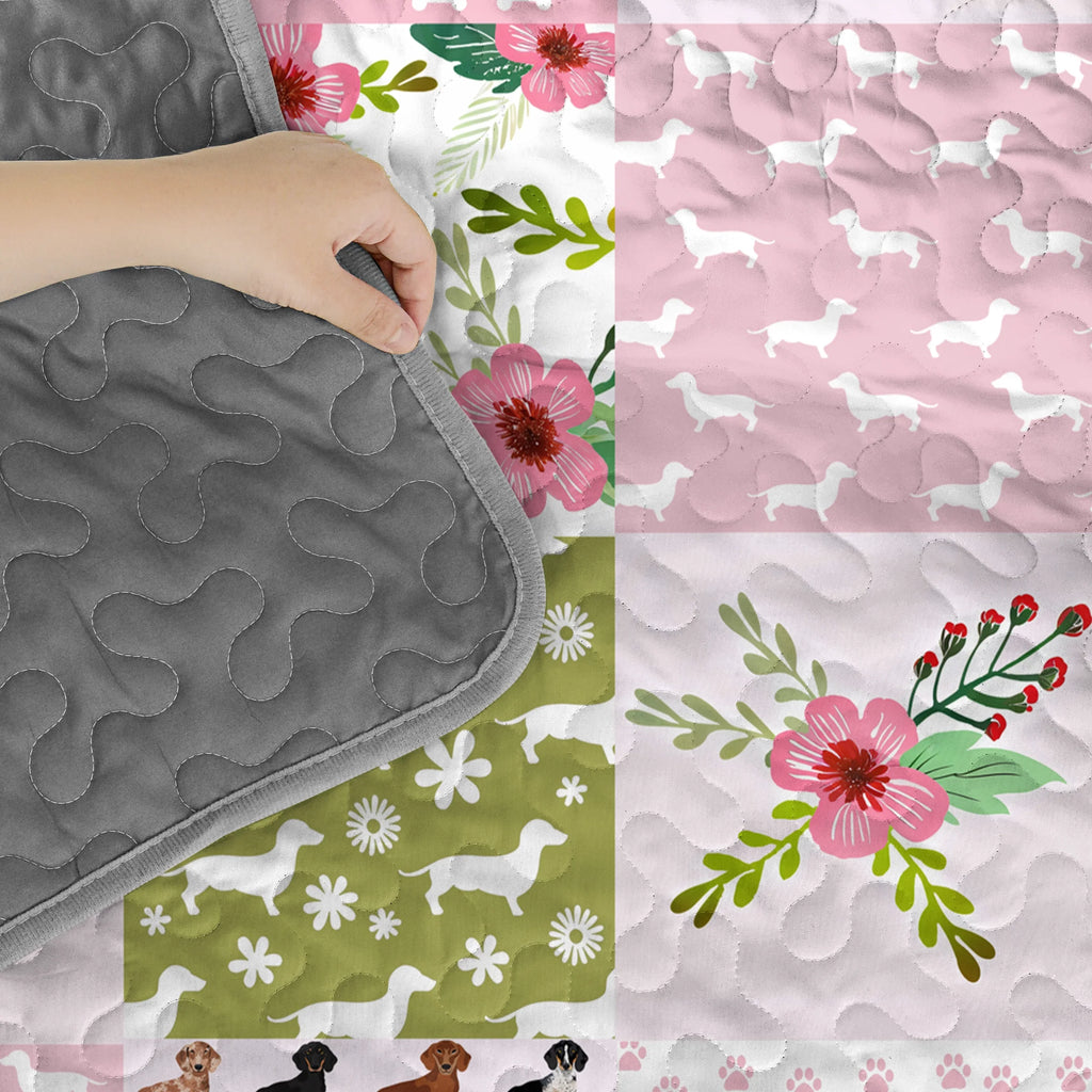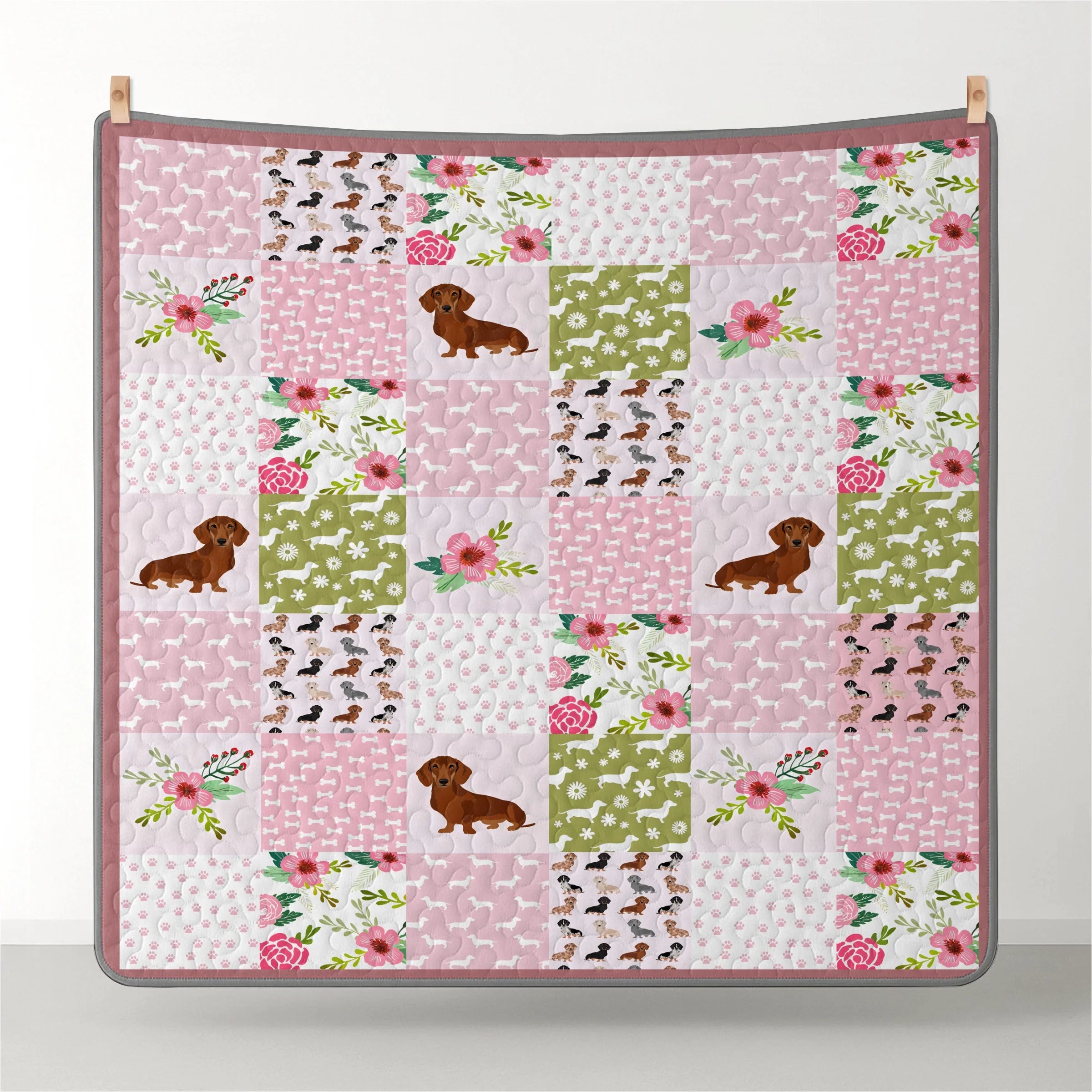 Wrap yourself in comfort with this soft floral patchwork dachshund-themed quilt set, where dachshunds illustrated in a sweet, gentle style arranged within alternating floral and hound print squares with pastel pinks, sage greens, and soft whites and delicate blossoms, polka dots, and silhouette dog patterns not only add charm to your bedroom but also bring a sense of sweetness, feminine charm, and tender coziness. Made from soft, lightweight fabric, this is the perfect choice for anyone who loves dachshunds and wants to feel connected to their furry friend even in their dreams.