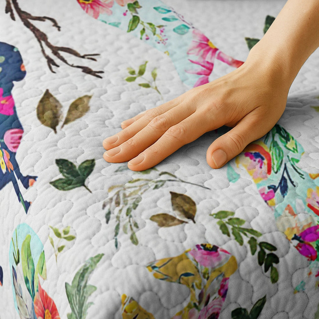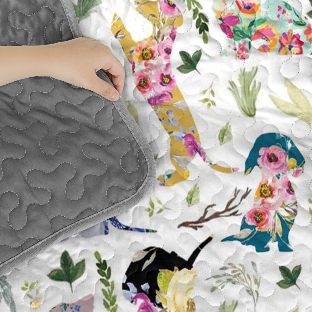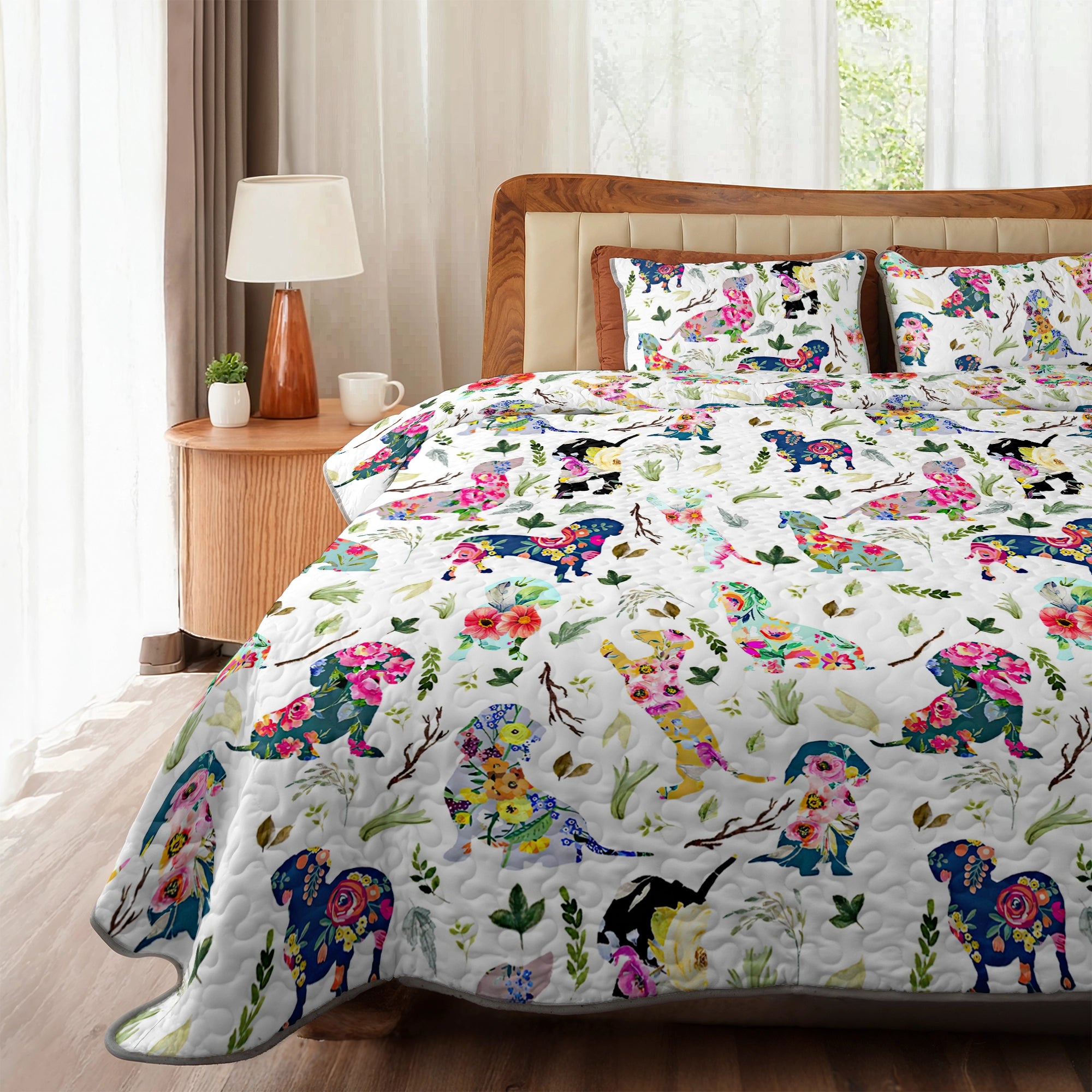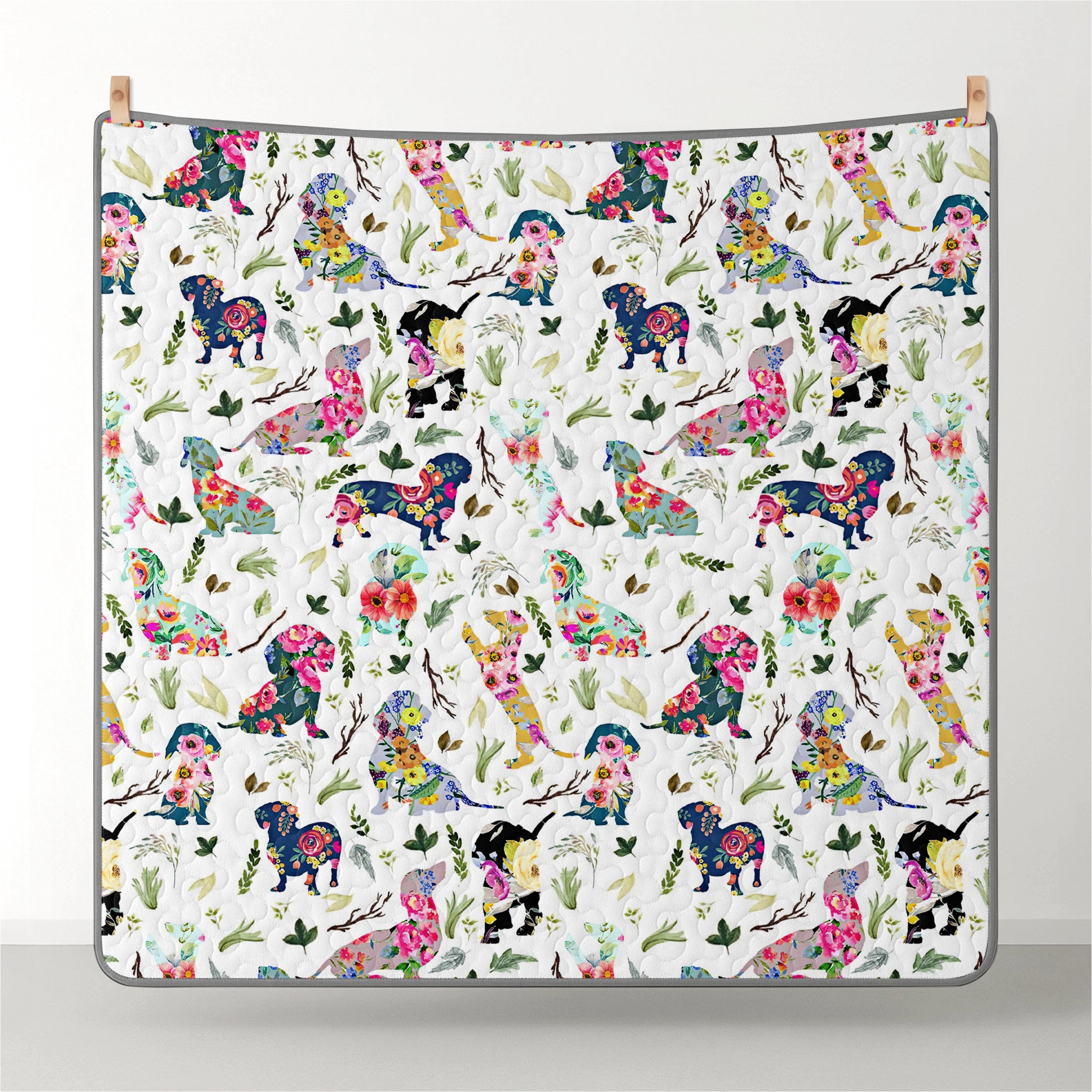 Wrap yourself in comfort with this vibrant floral fantasy dachshund quilt set, where dachshunds illustrated in bright, whimsical florals scattered across a soft white background with delicate leaves and branches with vivid pinks, electric blues, lemon yellows, emerald greens and fantasy-style dachshunds, garden foliage, and artistic composition not only add charm to your bedroom but also bring a sense of cheerful imagination, artistic flair, and light-hearted joy. Made from soft, lightweight fabric, this is the perfect choice for anyone who loves dachshunds and wants to feel connected to their furry friend even in their dreams.