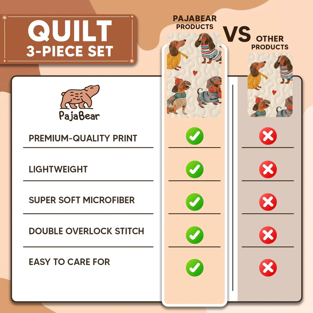 Soft, breathable, and dachshund-friendly, our quilt sets are made for cozy nights with your snuggly weenie. Lightweight yet warm, with a gentle texture youโll both adore.