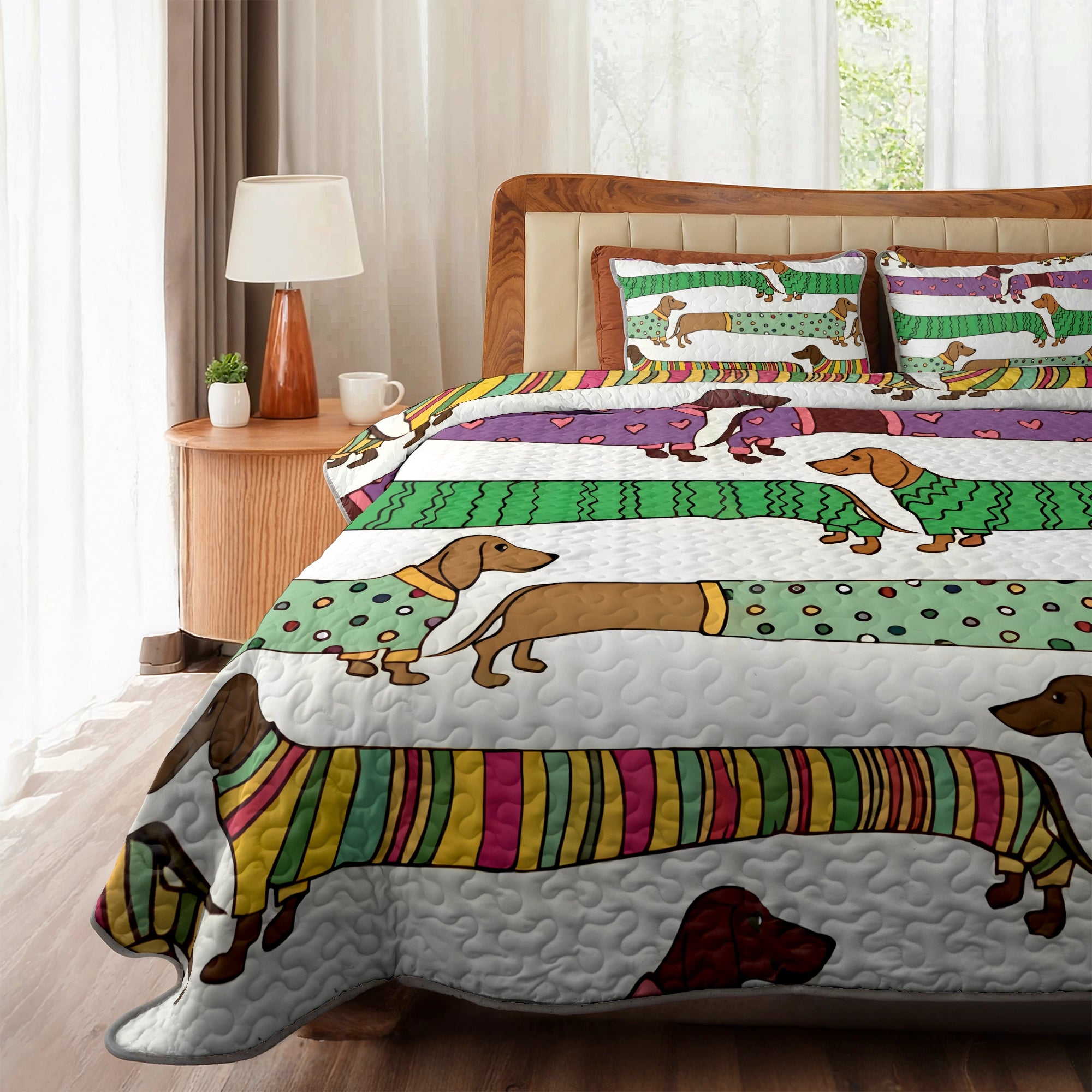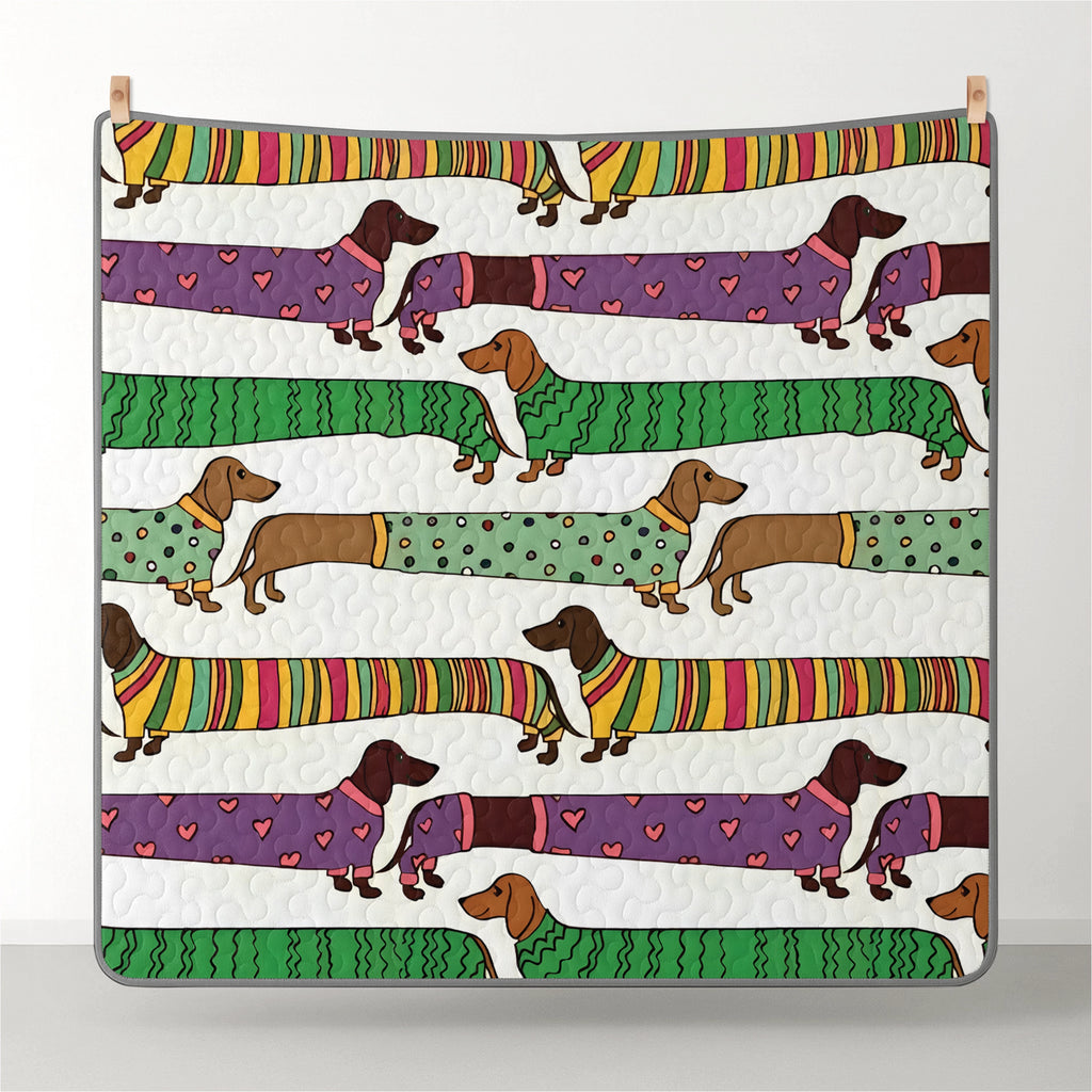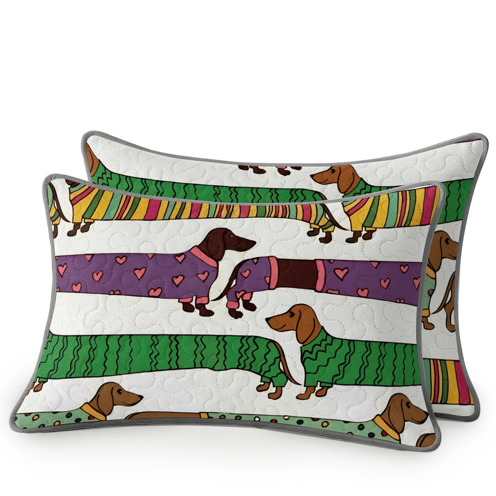 Wrap yourself in comfort with this playful striped dachshund-themed quilt set, where dachshunds illustrated in whimsical outfits stretched across bold horizontal stripes with vibrant greens, purples, and yellows and fun sweater textures and tiny heart patterns not only add charm to your bedroom but also bring a sense of joy, warmth, and playful charm. Made from soft, lightweight fabric, this is the perfect choice for anyone who loves dachshunds and wants to feel connected to their furry friend even in their dreams.
