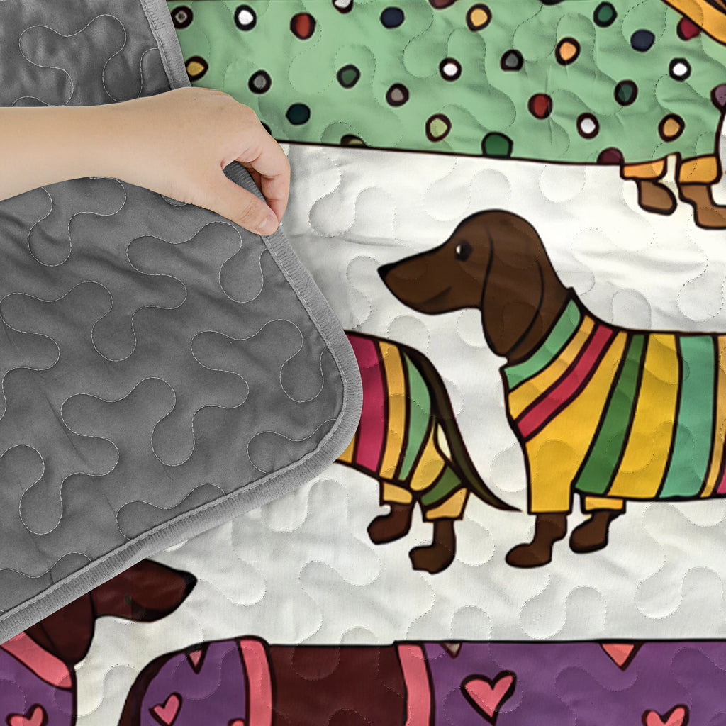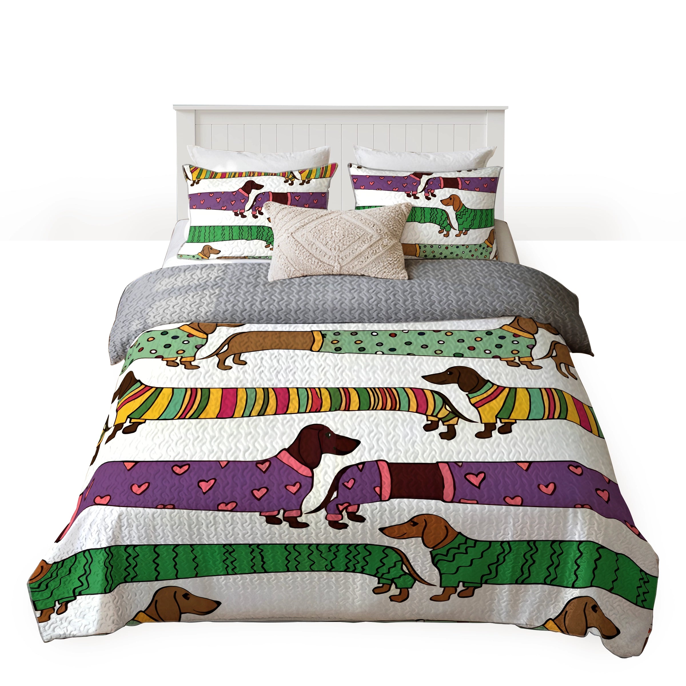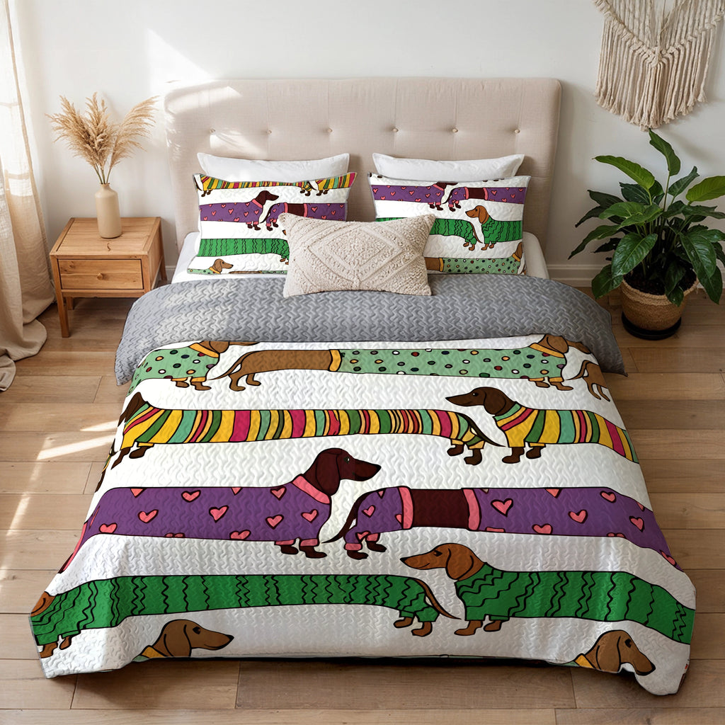 Wrap yourself in comfort with this playful striped dachshund-themed quilt set, where dachshunds illustrated in whimsical outfits stretched across bold horizontal stripes with vibrant greens, purples, and yellows and fun sweater textures and tiny heart patterns not only add charm to your bedroom but also bring a sense of joy, warmth, and playful charm. Made from soft, lightweight fabric, this is the perfect choice for anyone who loves dachshunds and wants to feel connected to their furry friend even in their dreams.