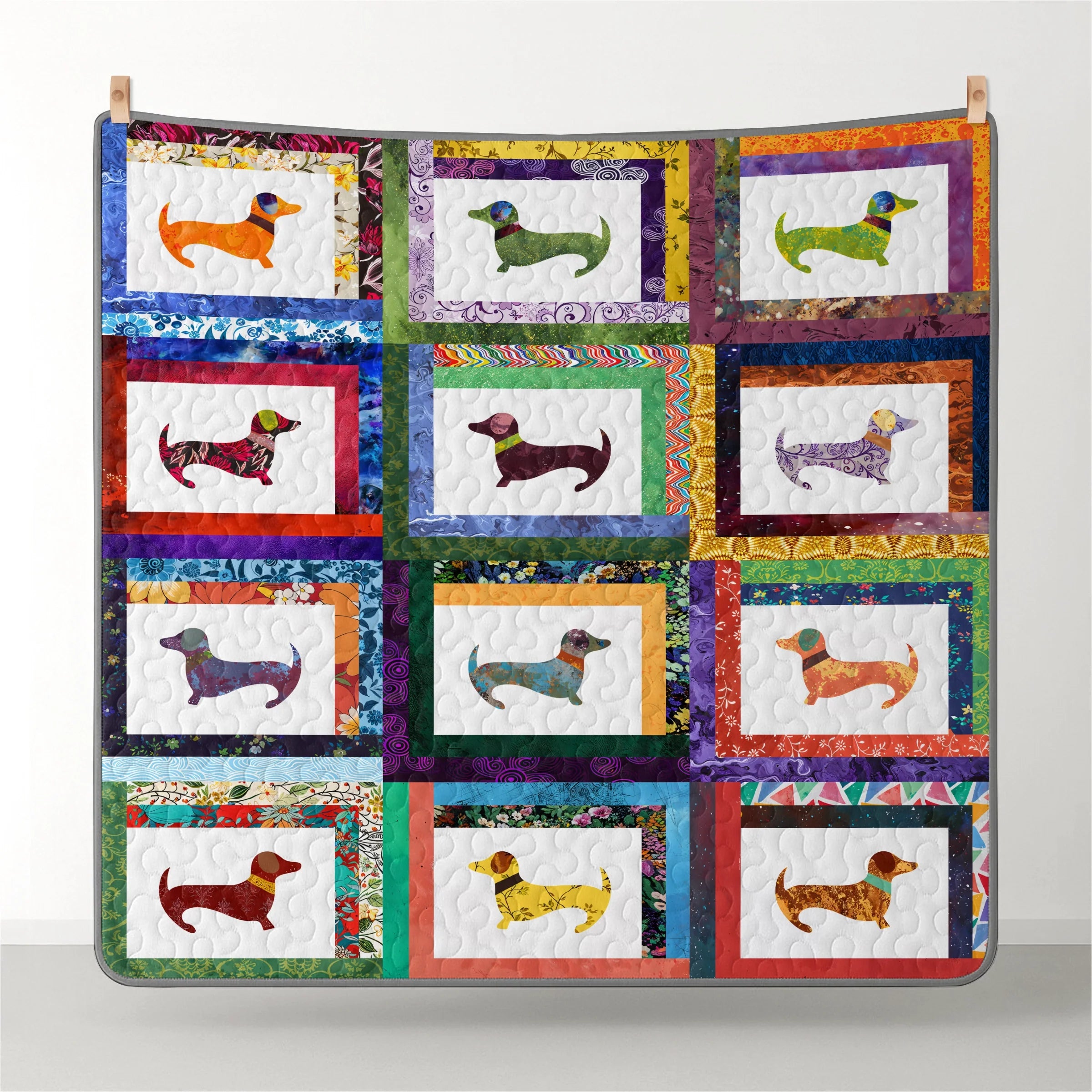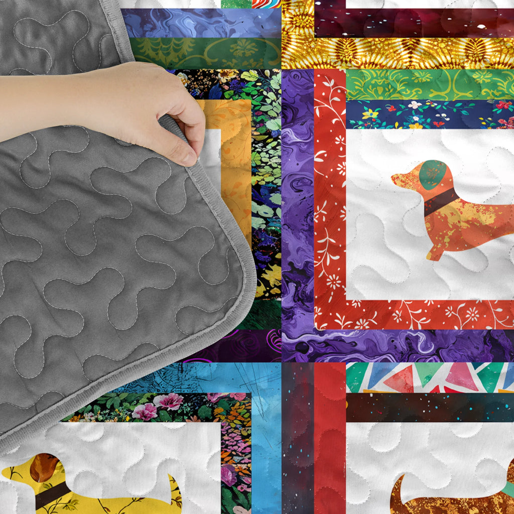 Wrap yourself in comfort with this colorful patchwork-style dachshund-themed quilt set, where dachshunds illustrated in bold fabric appliquรฉ style framed within vibrant patchwork quilt blocks with multicolor tones including jewel blues, oranges, greens, and purples and playful florals, geometric borders, and stitched textures not only add charm to your bedroom but also bring a sense of creativity, fun energy, and handcrafted warmth. Made from soft, lightweight fabric, this is the perfect choice for anyone who loves dachshunds and wants to feel connected to their furry friend even in their dreams.