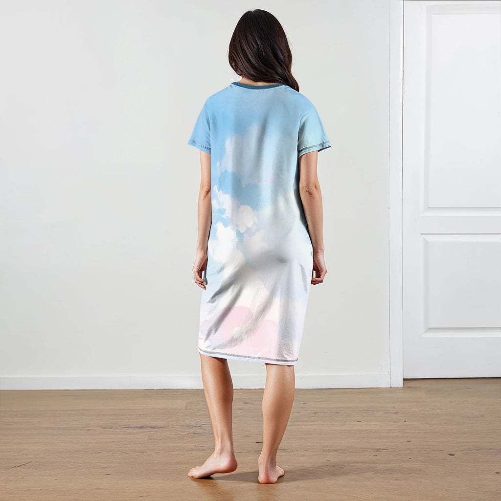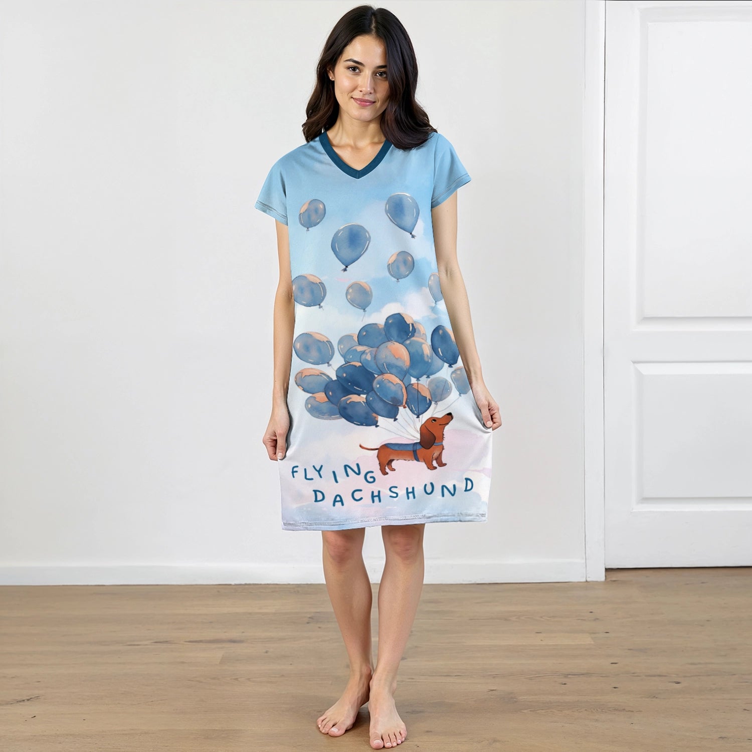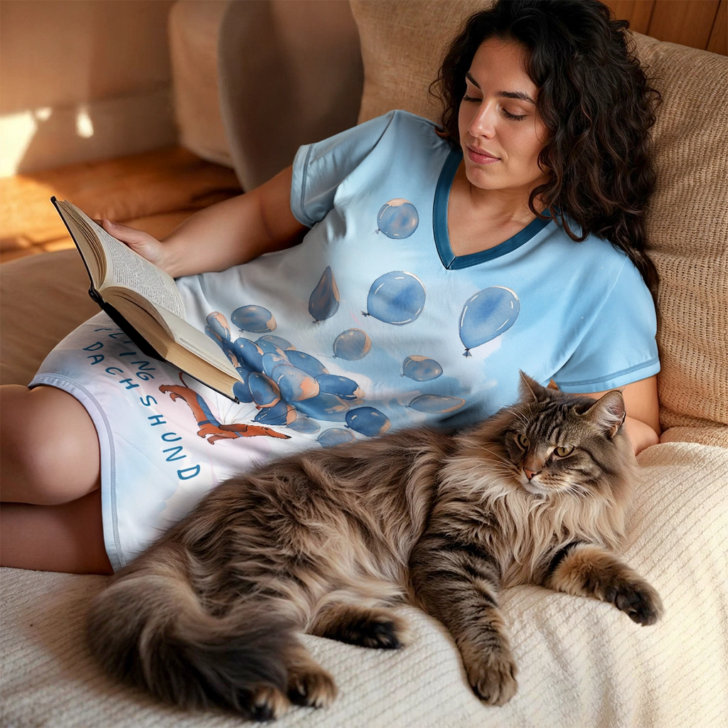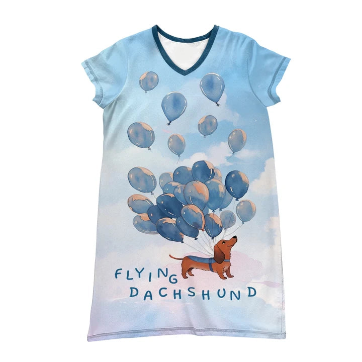 Lift your spirit with this whimsical nightdress featuring an adventurous dachshund soaring through the sky, carried by a bouquet of dreamy blue balloons. Set against a soft watercolor sky, this design brings a lighthearted charm and a touch of imagination to your bedtime routine. Crafted from gentle, breathable fabric, it's the perfect piece for those who dream big and believe in the magic of little moments—especially when shared with a loyal four-legged friend.