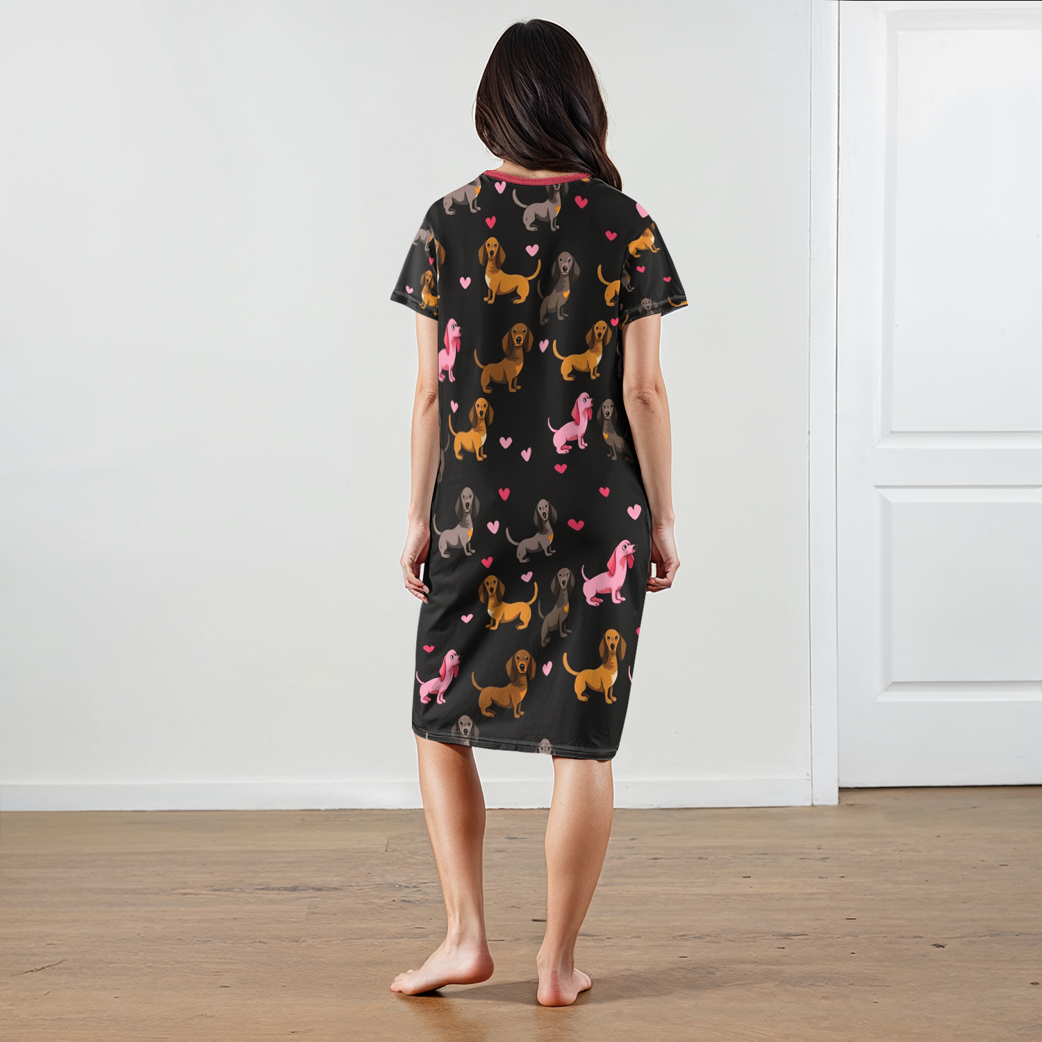 Wrap yourself in comfort with this adorably romantic sleepwear, where a playful pattern of dachshunds in shades of brown, gray, and pink is scattered among tiny hearts on a sleek black background not only enhances your style but also brings a sense of love, joy, and a heartwarming connection to your favorite pup. Made from soft, lightweight fabric, this is the perfect choice for anyone who loves dachshunds, playful prints, and expressing affection through cozy fashion.