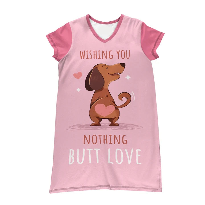 Wrap yourself in comfort with this playful and affectionate sleepwear, where a charming dachshund with a heart-shaped patch playfully expresses "Wishing You Nothing Butt Love" against a soft pink background not only adds a touch of humor and warmth but also brings a sense of joy, love, and a deep connection to your furry companion. Made from soft, lightweight fabric, this is the perfect choice for anyone who loves dogs and wants to carry a little extra love into their dreams.