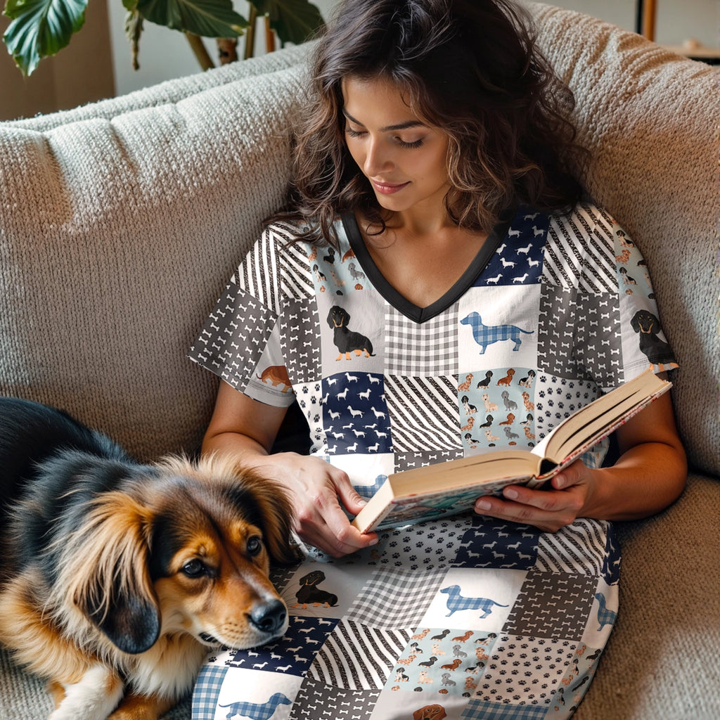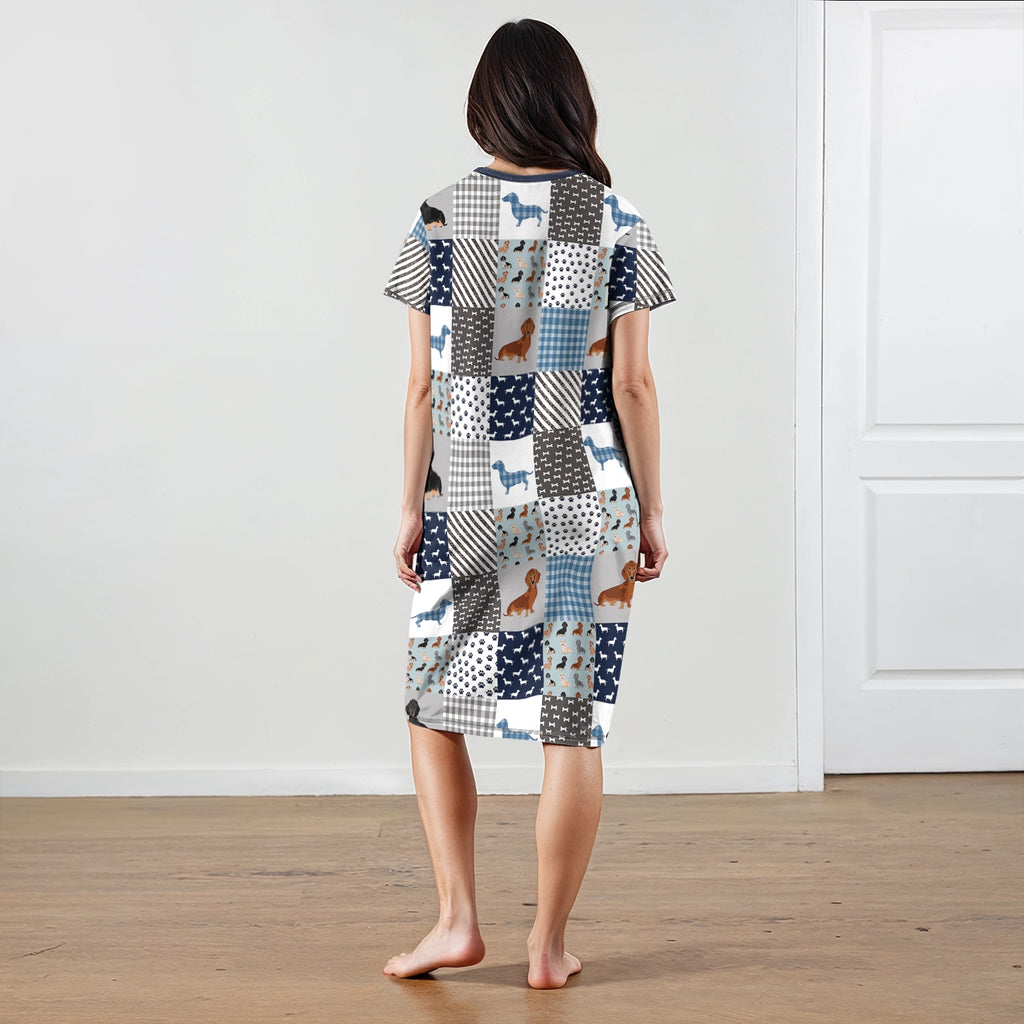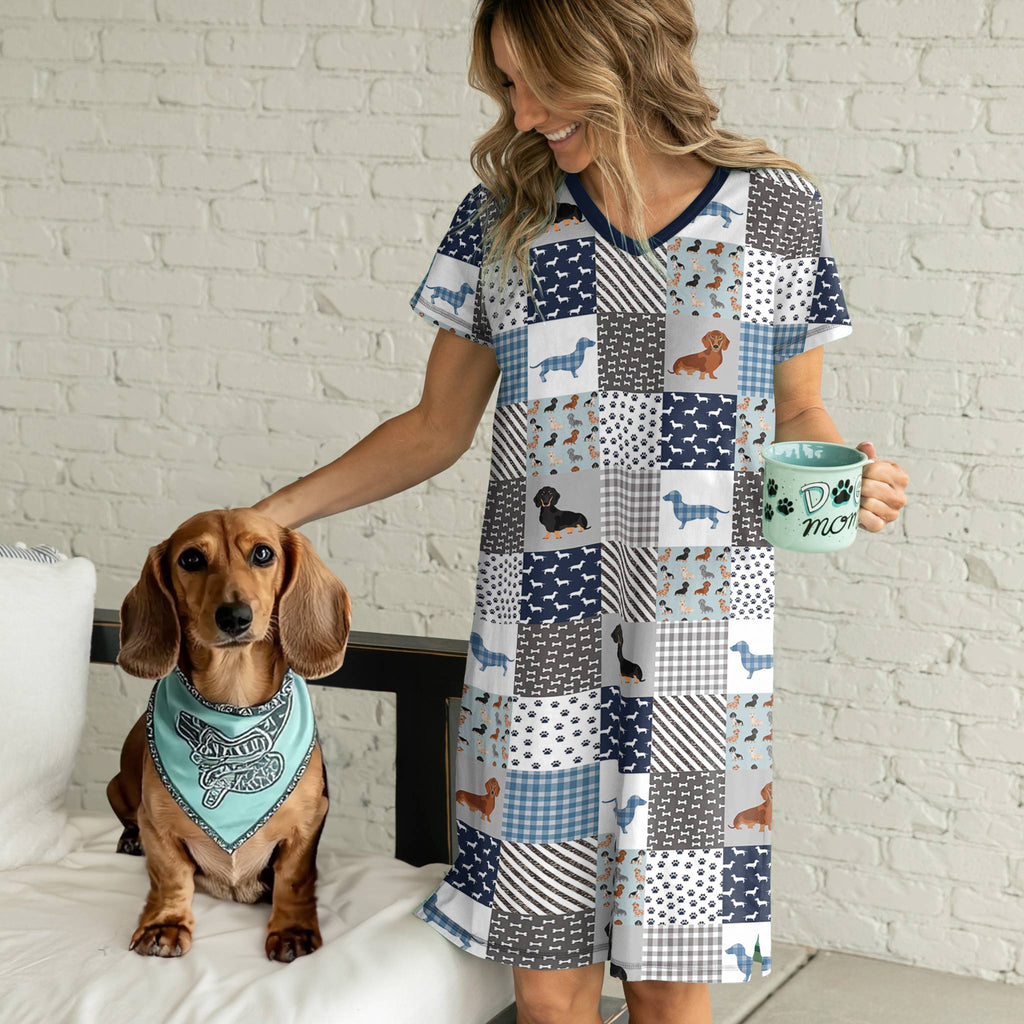 Wrap yourself in comfort with this classic and cozy sleepwear, where a patchwork of dachshund illustrations, plaid patterns, paw prints, and bones in calming blue, grey, and brown tones creates a nostalgic quilted effect not only enhances your style but also brings a sense of warmth, comfort, and the timeless charm of handcrafted love. Made from soft, lightweight fabric, this is the perfect choice for anyone who treasures dachshunds, cozy nights, and the sentimental feel of a patchwork quilt.