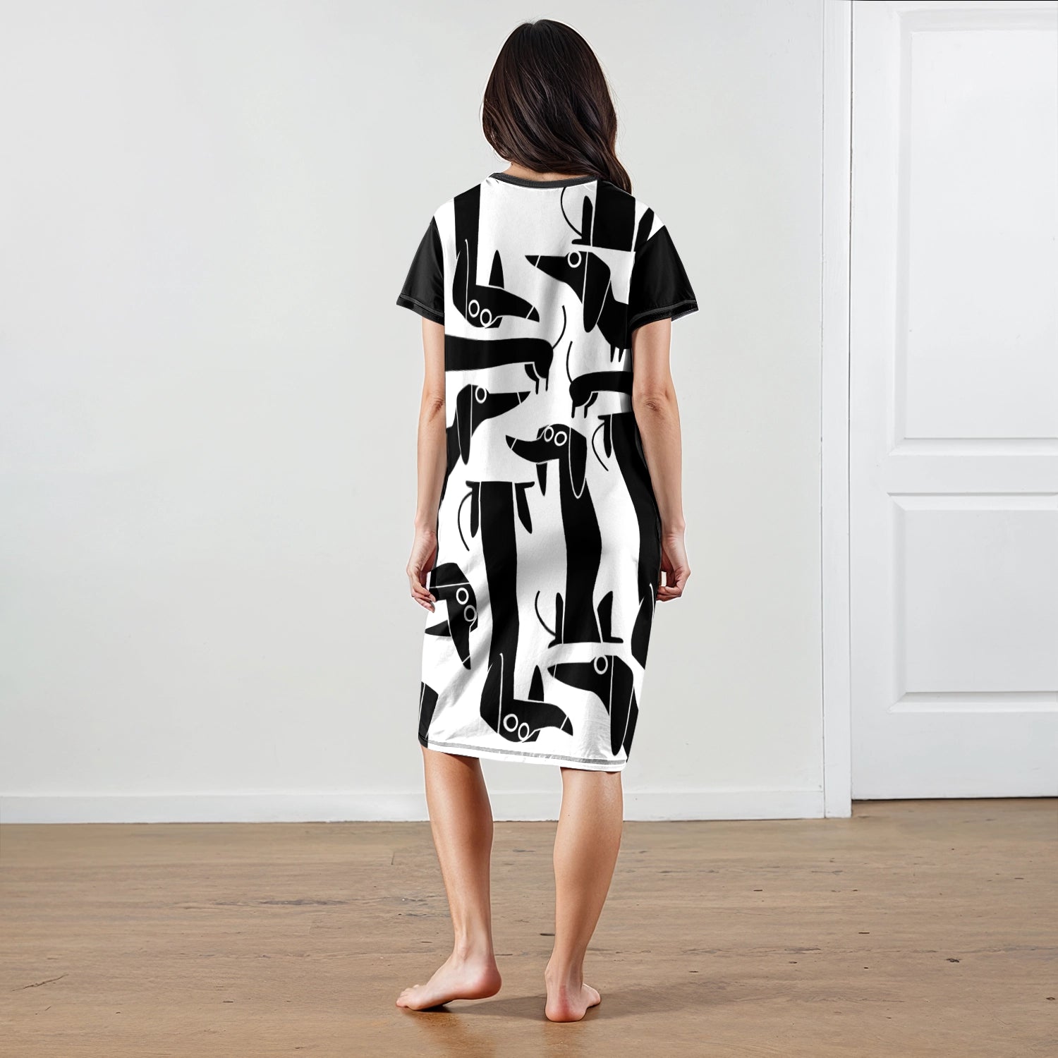 Wrap yourself in comfort with this modern graphic sleepwear, where bold black dachshund silhouettes stretch playfully across a crisp white background, creating a striking and contemporary pet-themed pattern. These quirky shapes not only add charm to your outfit but also bring a sense of fun, creativity, and bold expression. Made from soft, lightweight fabric, this is the perfect choice for anyone who loves dogs and wants to feel connected to their furry friend even in their dreams.
