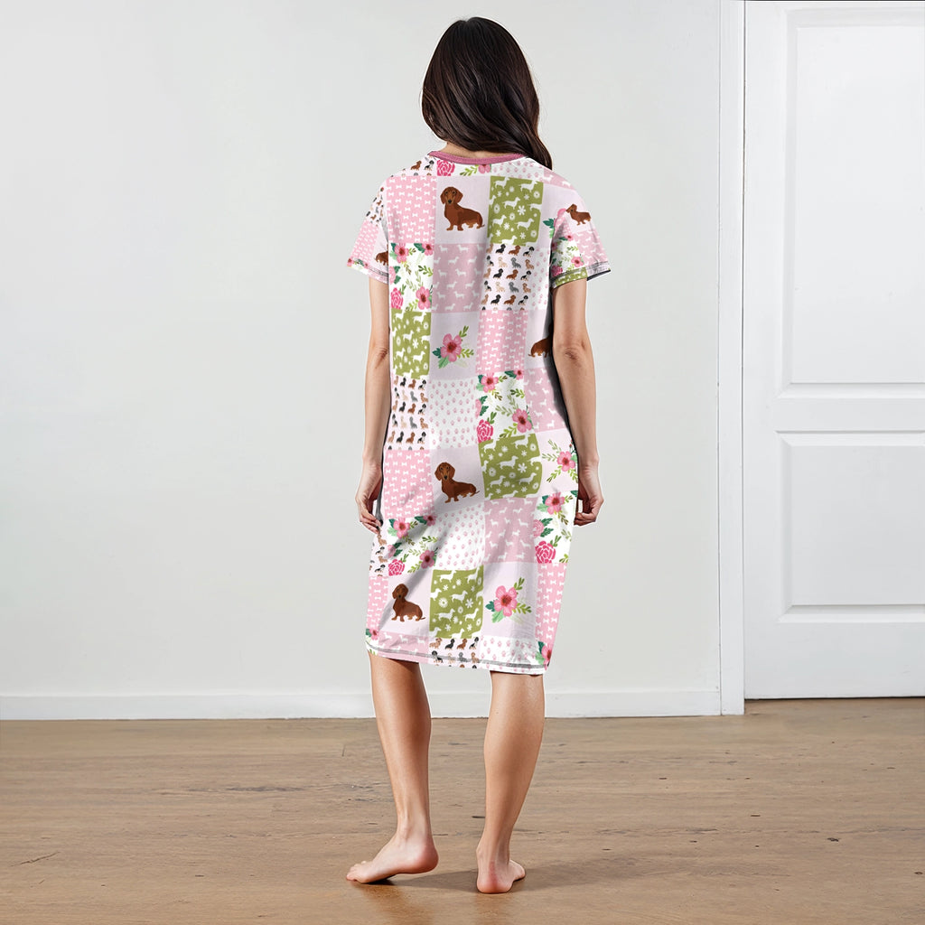 Wrap yourself in comfort with this sweet and playful sleepwear, where charming dachshund illustrations are nestled within a delightful patchwork of floral prints, polka dots, and soft pastel tones. The harmonious blend of pink, green, and white evokes a gentle, countryside charm that soothes the soul. Made from soft, breathable fabric, this nightdress is perfect for dachshund lovers who adore a mix of whimsy and warmth in their bedtime retreat.