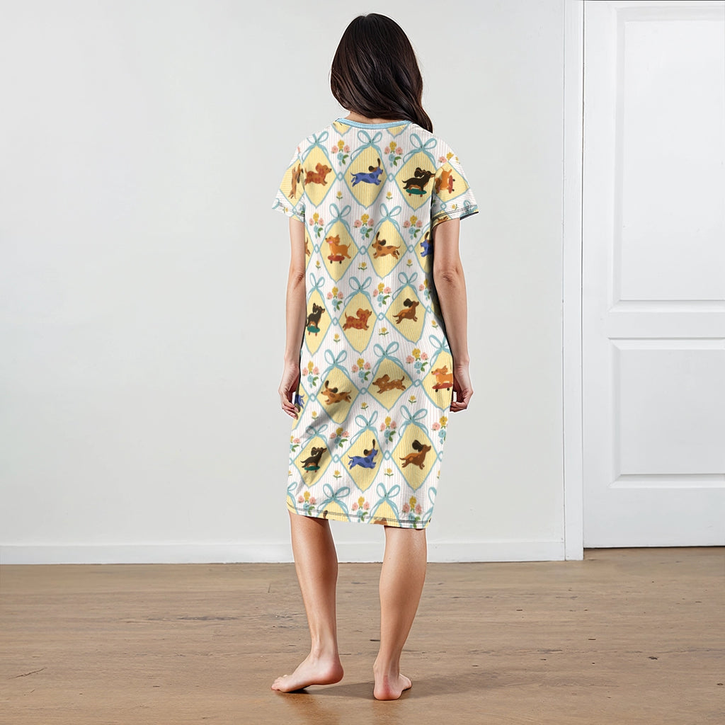 Wrap yourself in comfort with this playful and pastel-toned sleepwear, where adorable dachshunds peek out of ribbon-tied frames surrounded by cheerful florals. This sweet, pet-themed pattern not only adds a whimsical charm to your outfit but also brings a sense of coziness, joy, and gentle nostalgia. Made from soft, lightweight fabric, this is the perfect choice for anyone who loves dogs and wants to carry their playful spirit into their dreams.