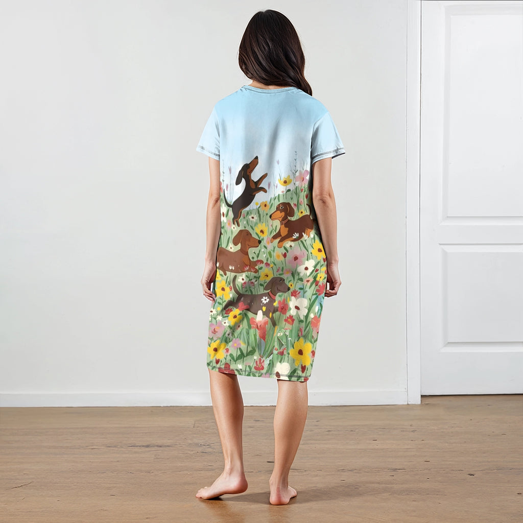 Wrap yourself in comfort with this joyful and playful sleepwear, where cheerful dachshunds frolic through a blooming wildflower meadow under a soft blue sky. This heartwarming pattern not only adds charm to your outfit but also brings a sense of happiness, freedom, and a lively connection to your furry companions. Made from soft, lightweight fabric, this is the perfect choice for anyone who loves dogs and wants to carry the spirit of springtime and puppy joy into their dreams.