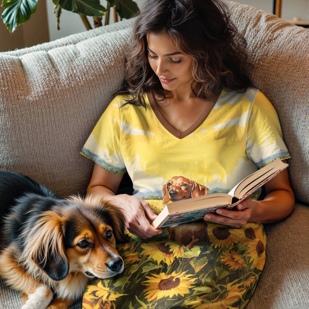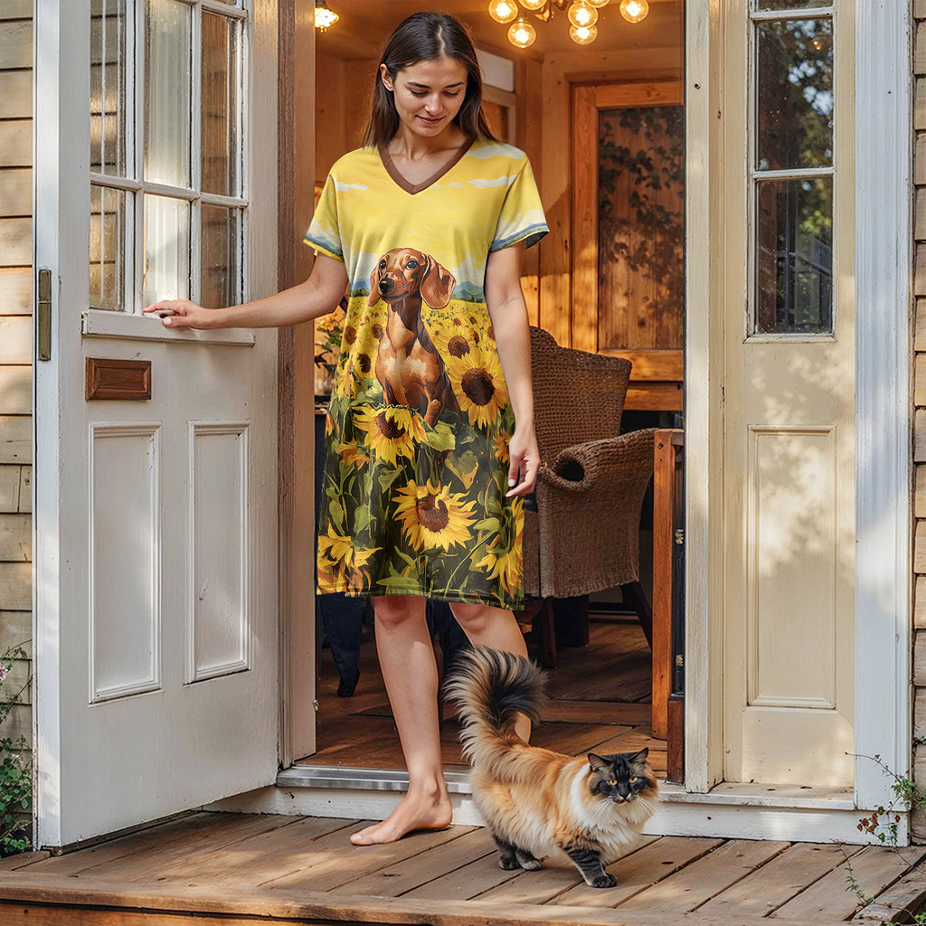Dachshine Nightshirts V-neck Sunflower Dachshund