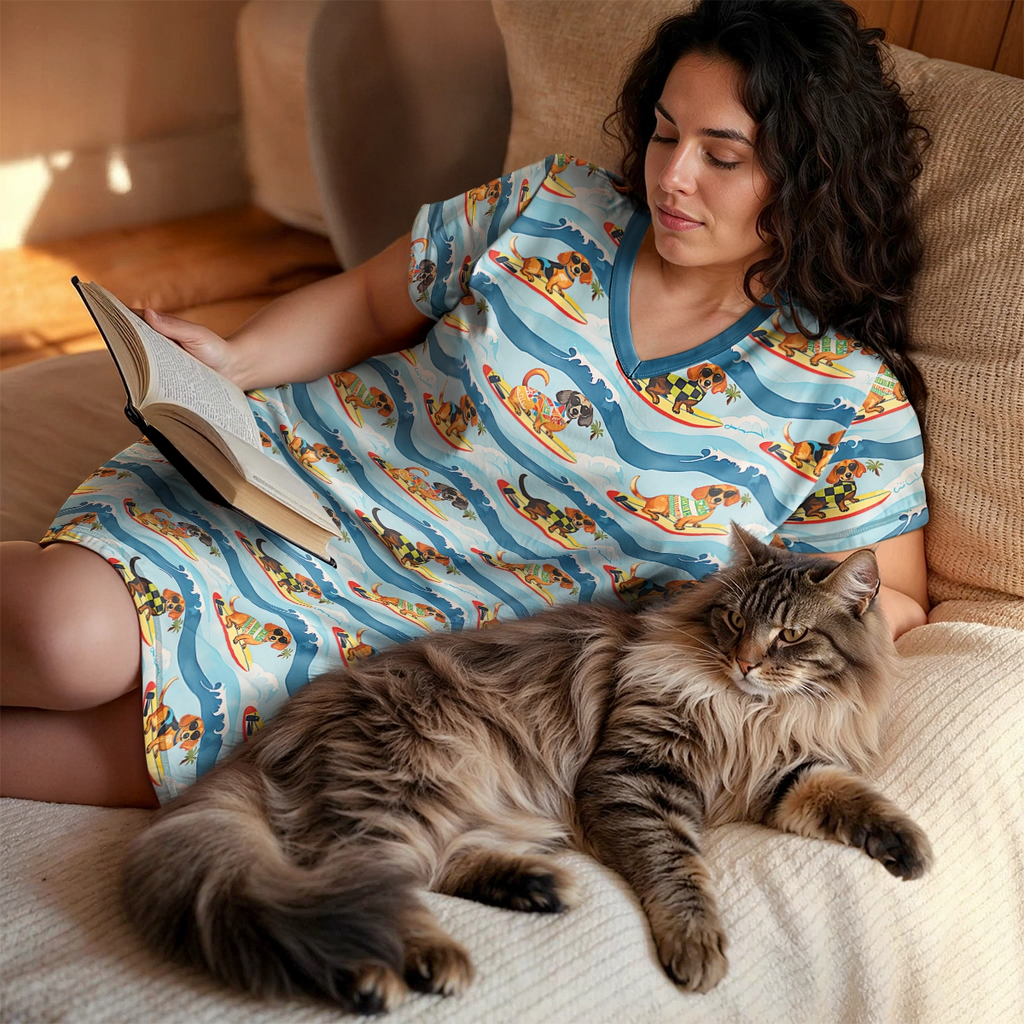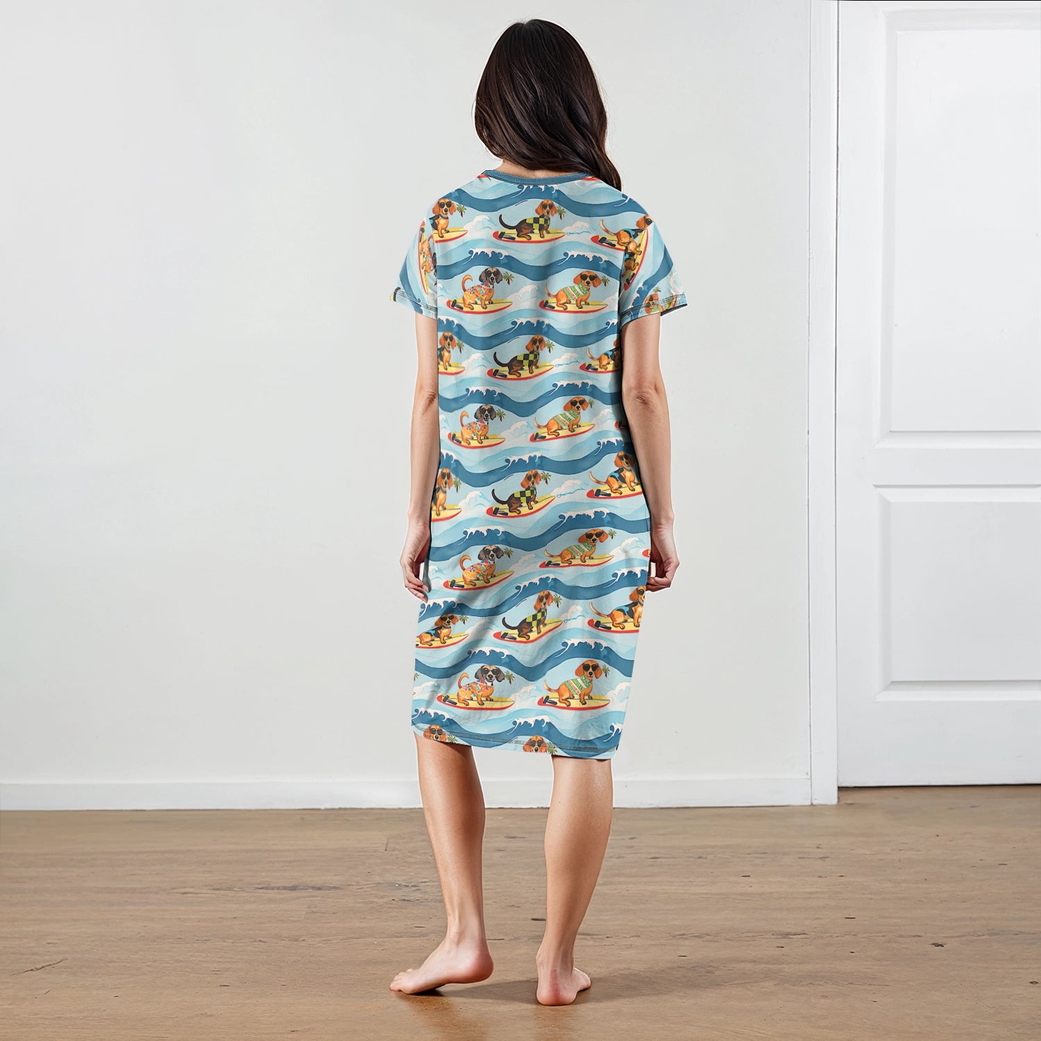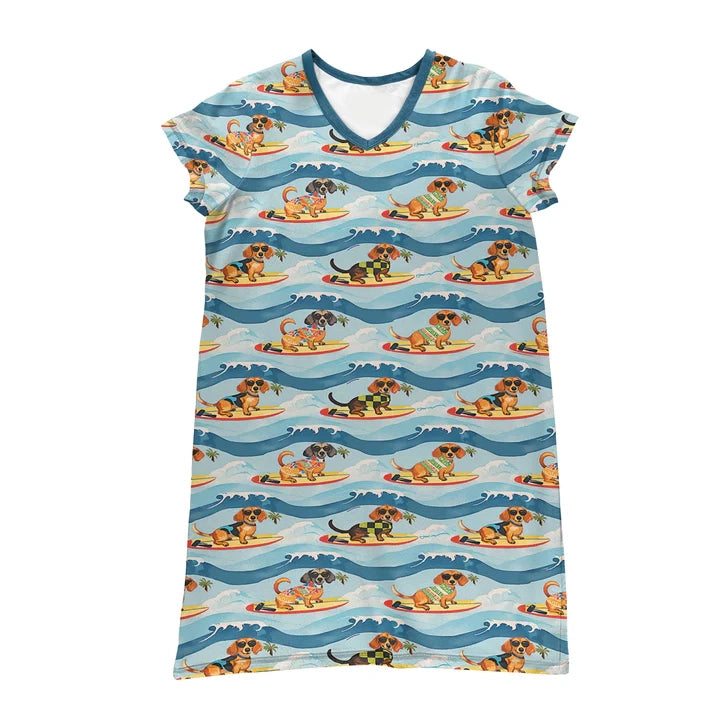 Wrap yourself in comfort with this fun-loving and breezy sleepwear, where dachshunds riding colorful surfboards over playful blue waves not only brighten up your look but also bring a sense of freedom, joy, and a lighthearted escape to tropical vibes. Made from soft, lightweight fabric, this is the perfect choice for anyone who loves dogs and dreams of sunny beach days filled with laughter and wagging tails.