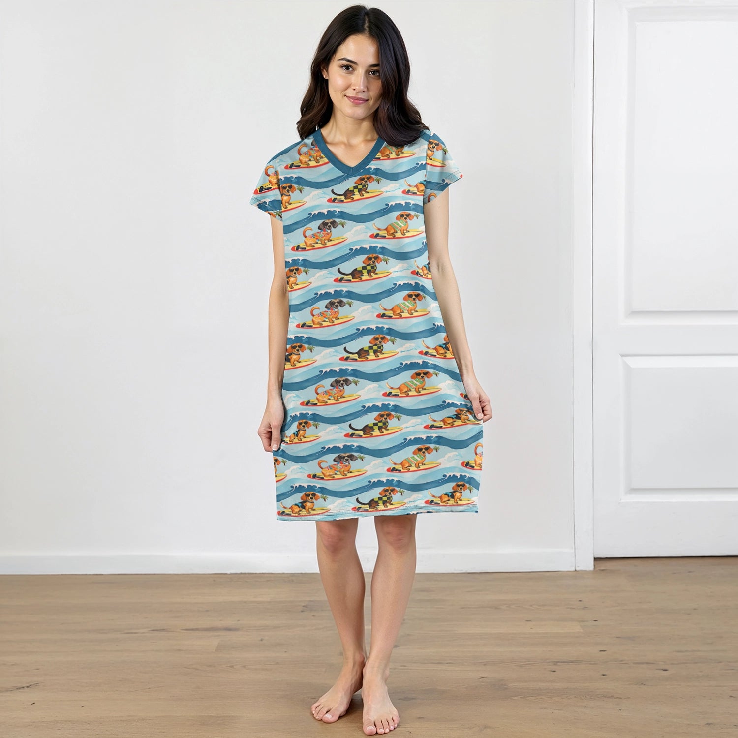 Dachshine Nightshirts V-neck Dachshund Surfing