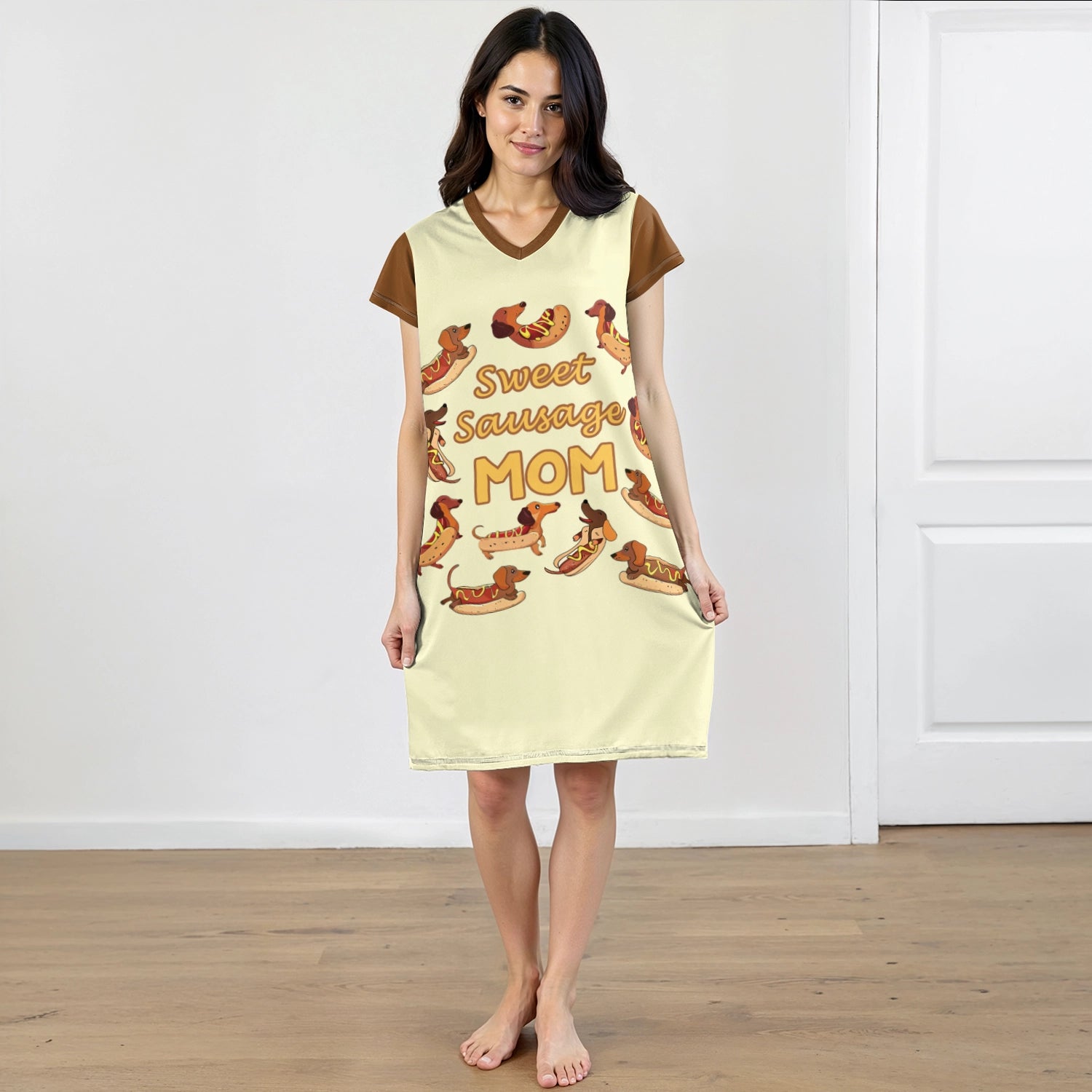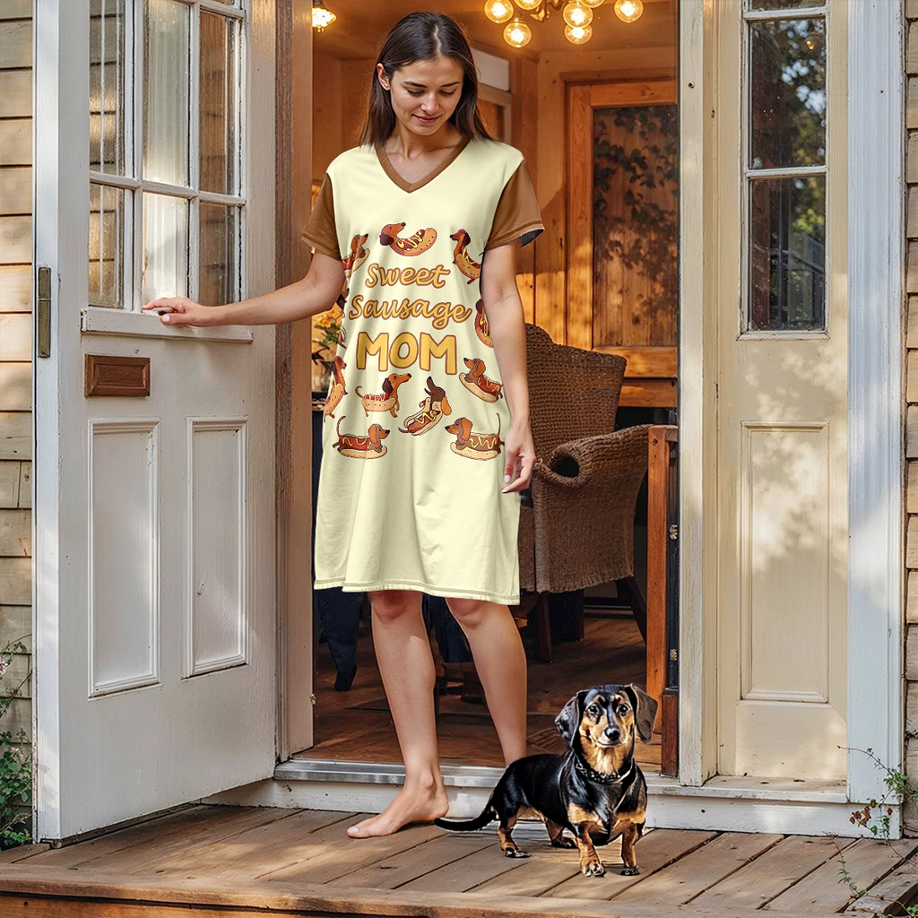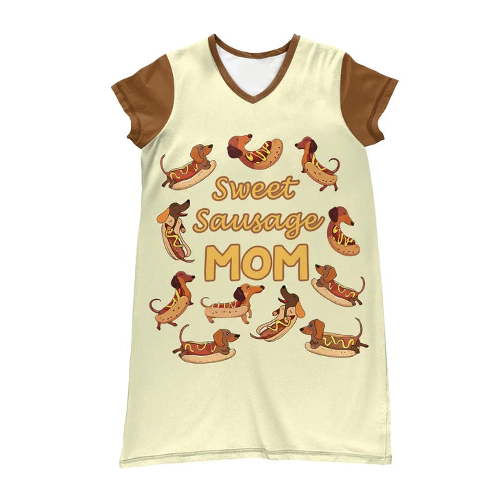 Celebrate the joy of being a dachshund mama with this adorable and cheeky nightdress, where playful sausage dogs dressed as hotdogs dance across a creamy background. The fun "Sweet Sausage Mom" message adds a dash of humor and heart, perfect for dog moms who adore their little wieners. Crafted in cozy, lightweight fabric, this sleepwear brings warmth, comfort, and a whole lot of personality to your nighttime wardrobe—because every dog mom deserves to sleep with a smile.