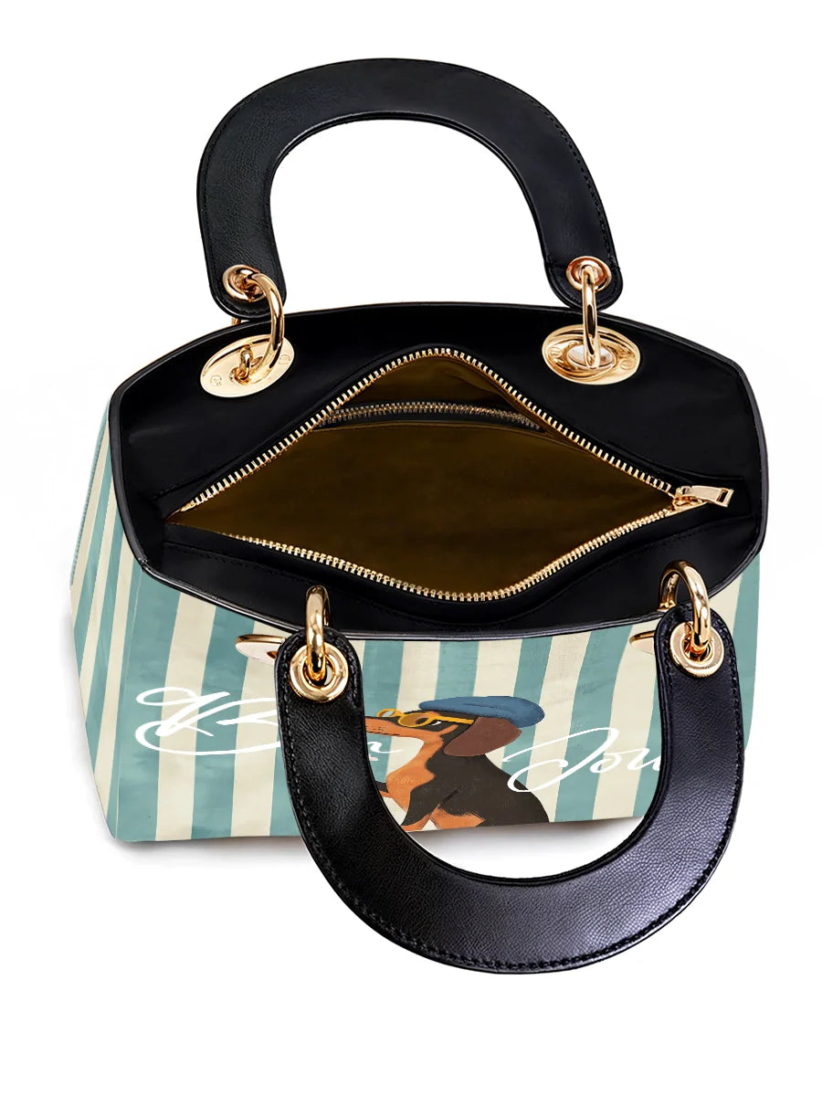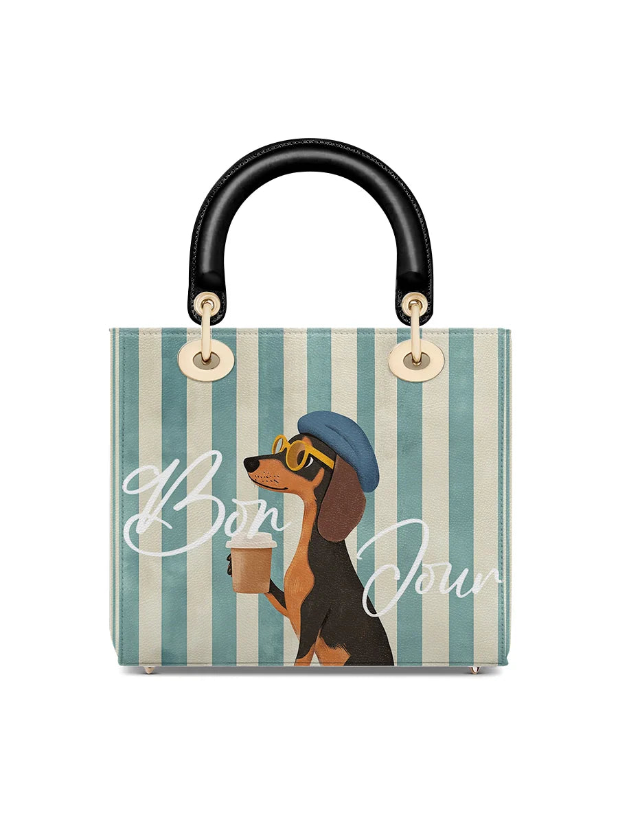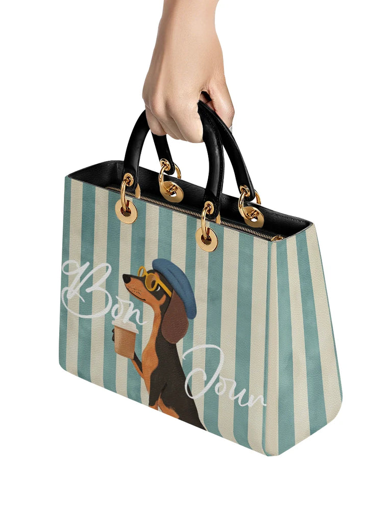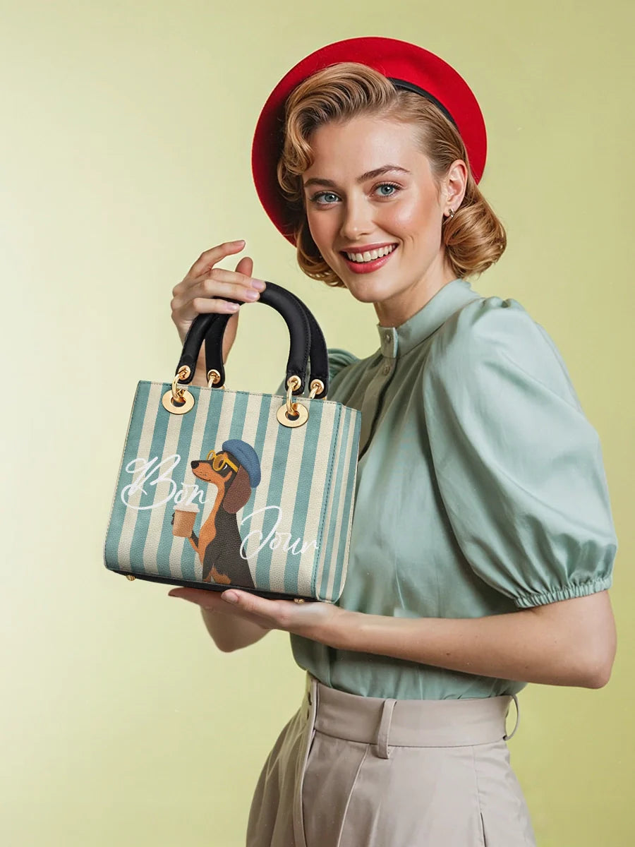 Say Bonjour to effortless charm. This chic lady leather bag showcases a Dachshund with undeniable Parisian flair — sporting a blue beret, retro sunglasses, and a to-go coffee cup, all set against vintage teal-and-cream stripes. It’s the kind of bag that turns sidewalks into cobblestone strolls and mornings into little moments of style.