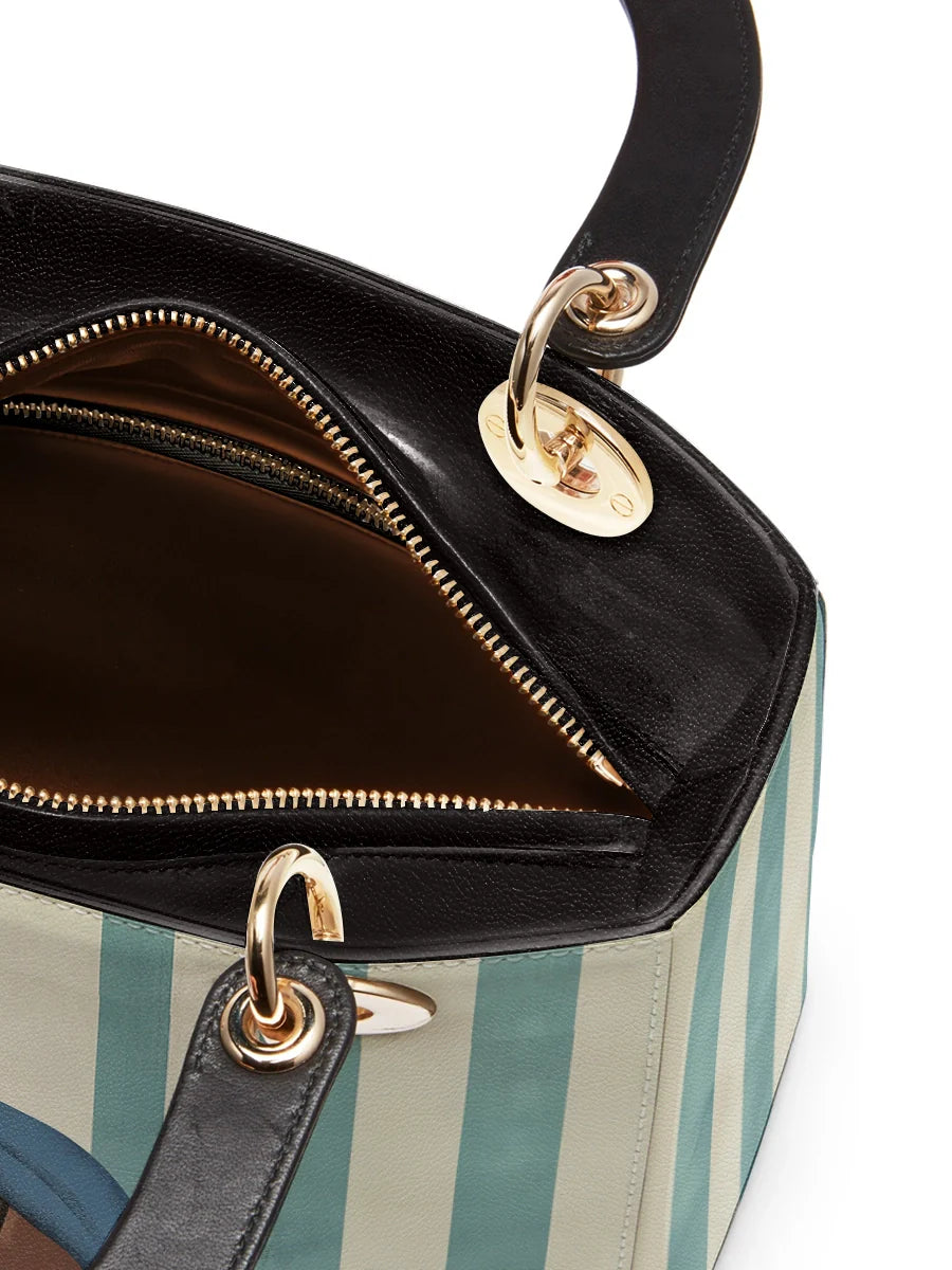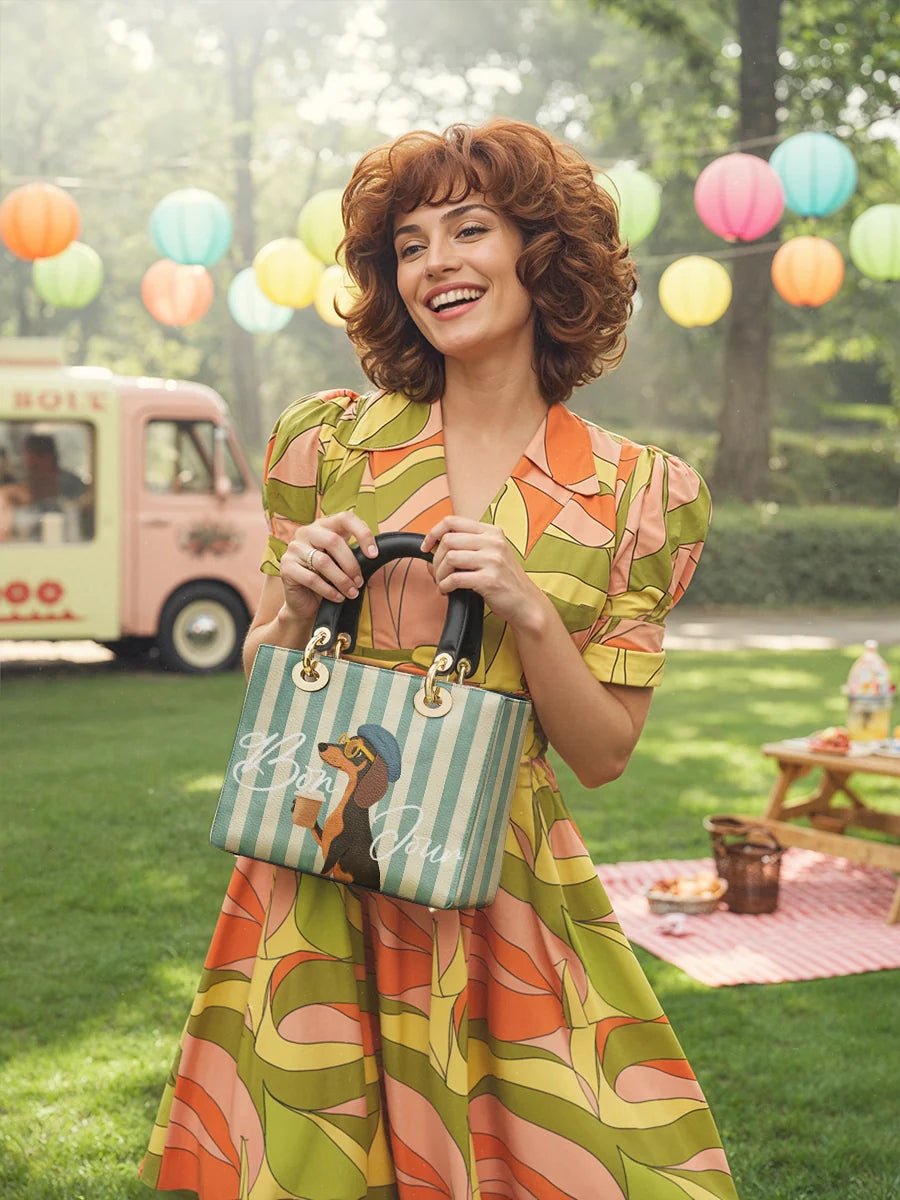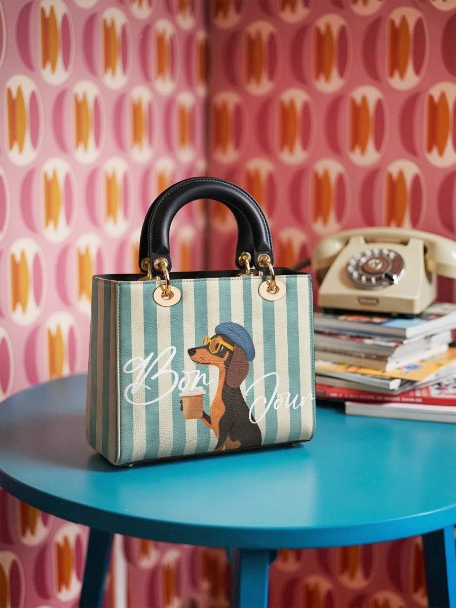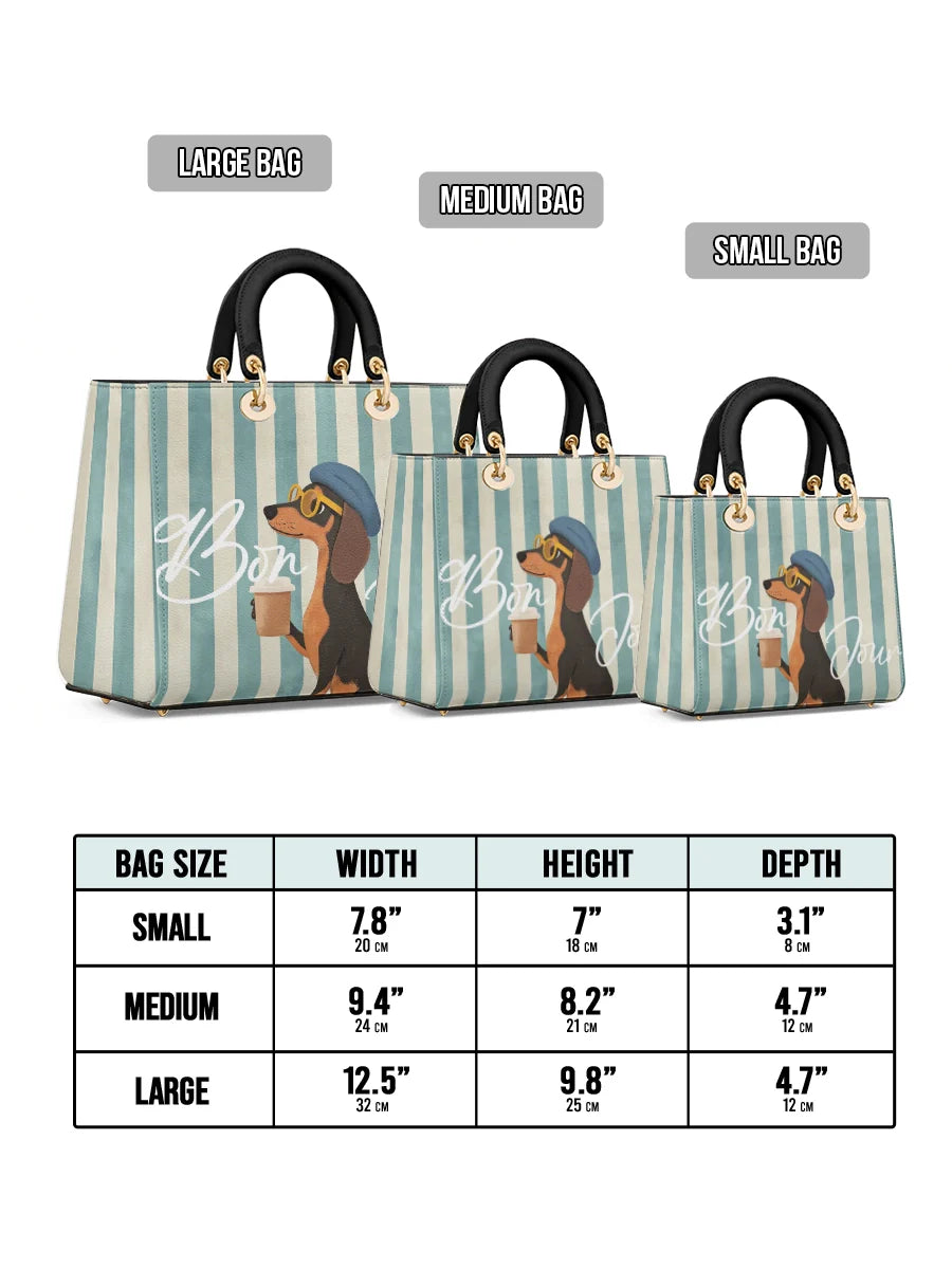Say Bonjour to effortless charm. This chic lady leather bag showcases a Dachshund with undeniable Parisian flair — sporting a blue beret, retro sunglasses, and a to-go coffee cup, all set against vintage teal-and-cream stripes. It’s the kind of bag that turns sidewalks into cobblestone strolls and mornings into little moments of style.