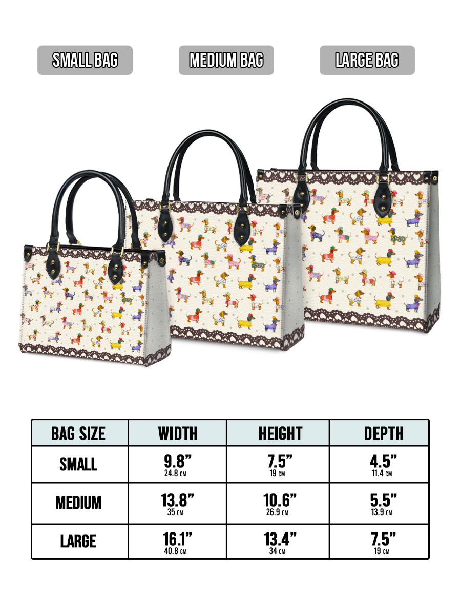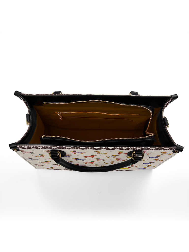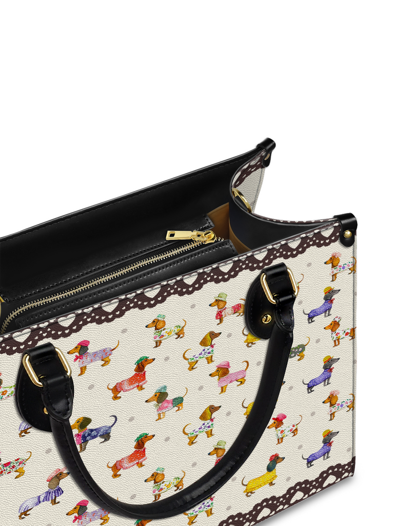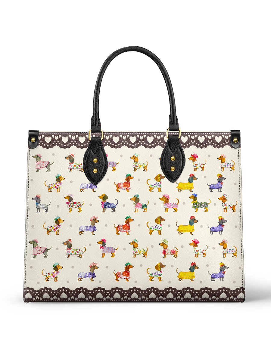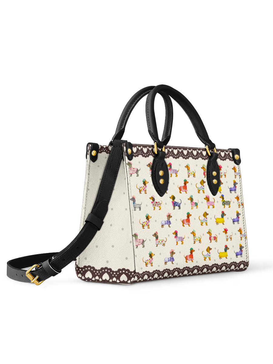 Doxie Parade is a joyful fashion march of stylish dachshunds — each one dressed in its own quirky outfit, trotting across a creamy canvas framed with playful polka dots and lacey heart borders. With every step and color, this bag captures the cheerful chaos of dachshund personality and charm.