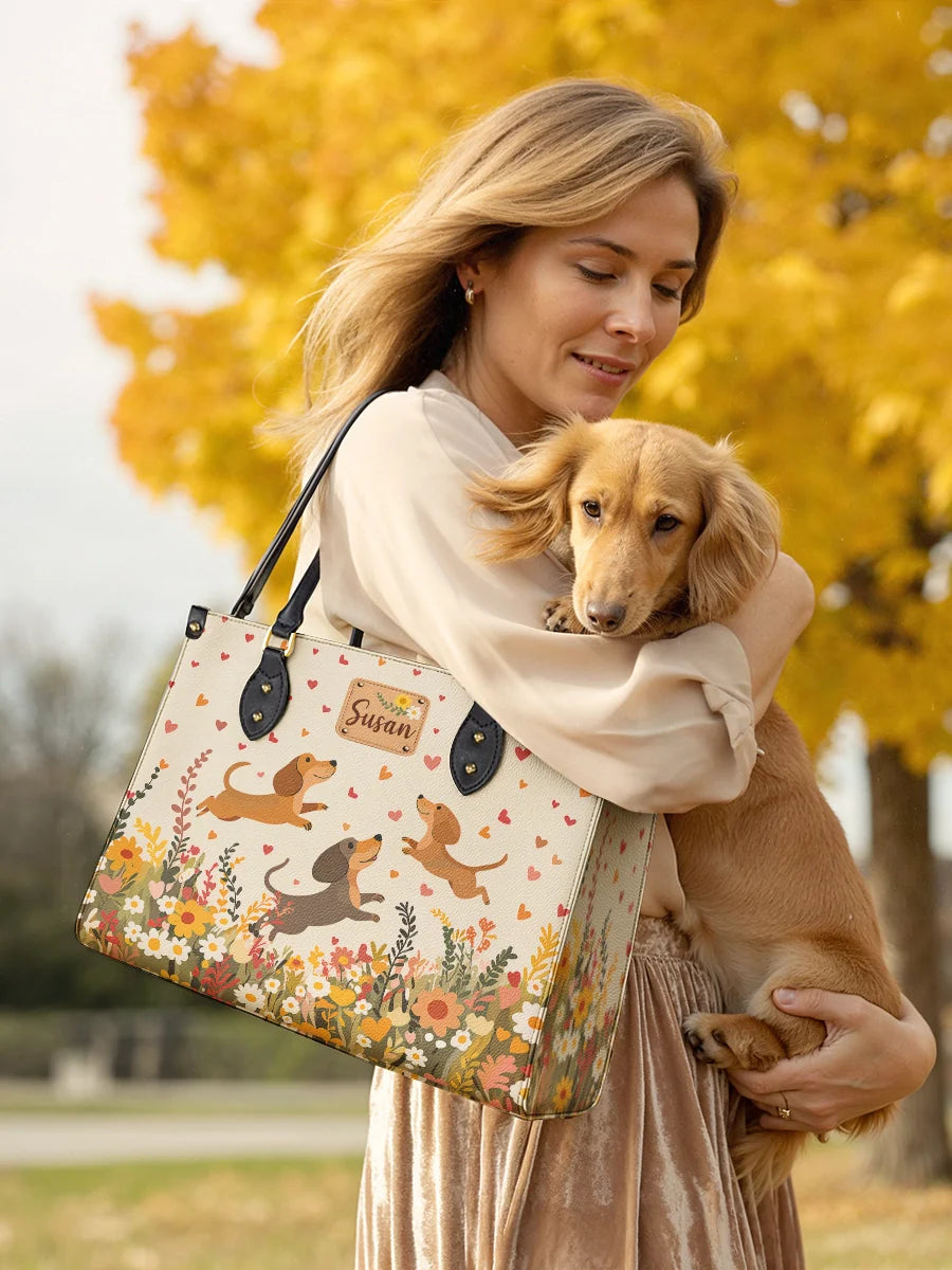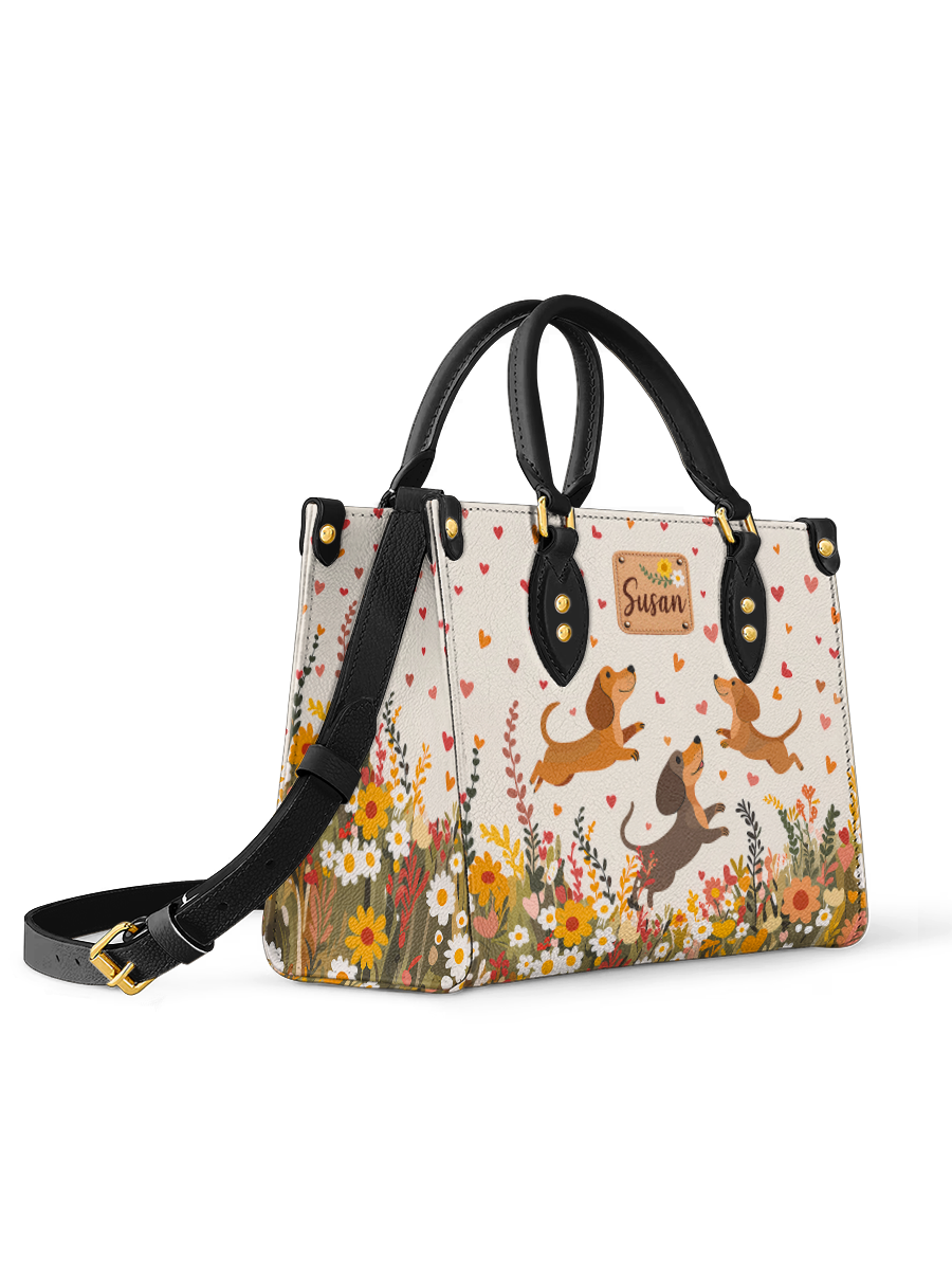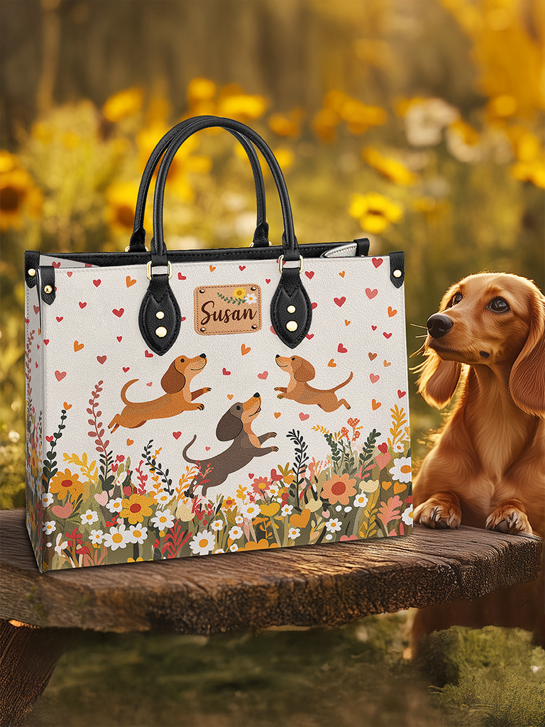 Dachshine Floral Dachshund With Heart Personalized Leather Bag