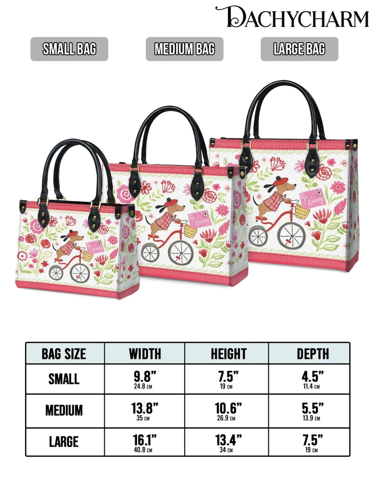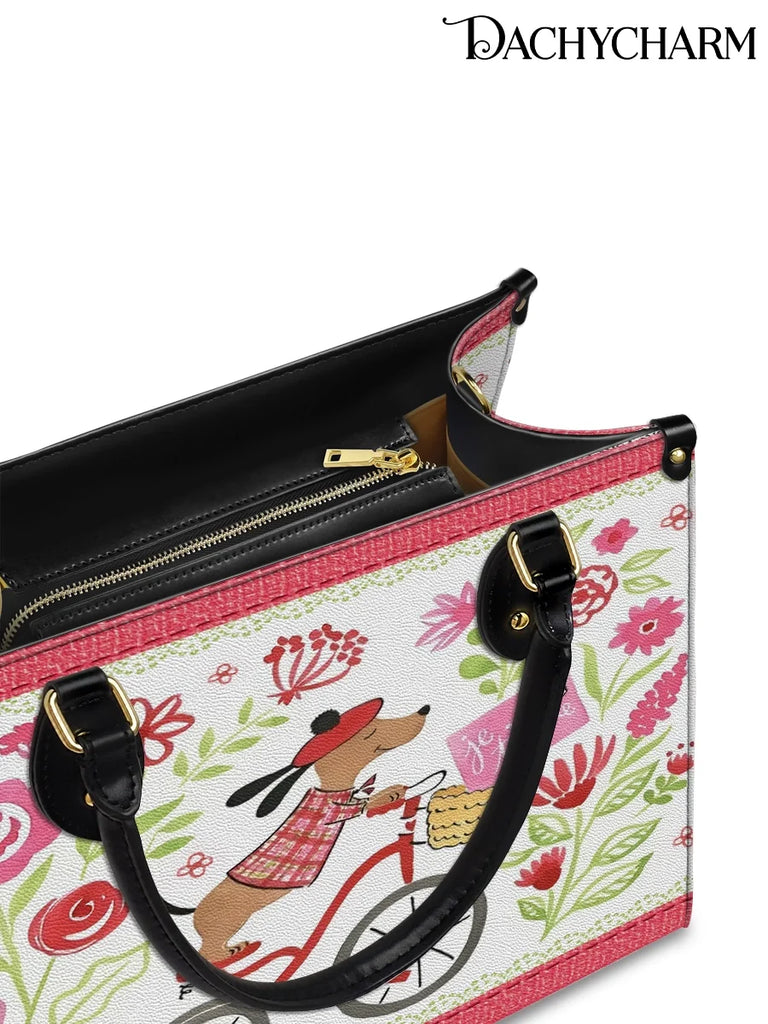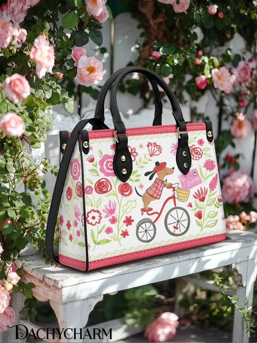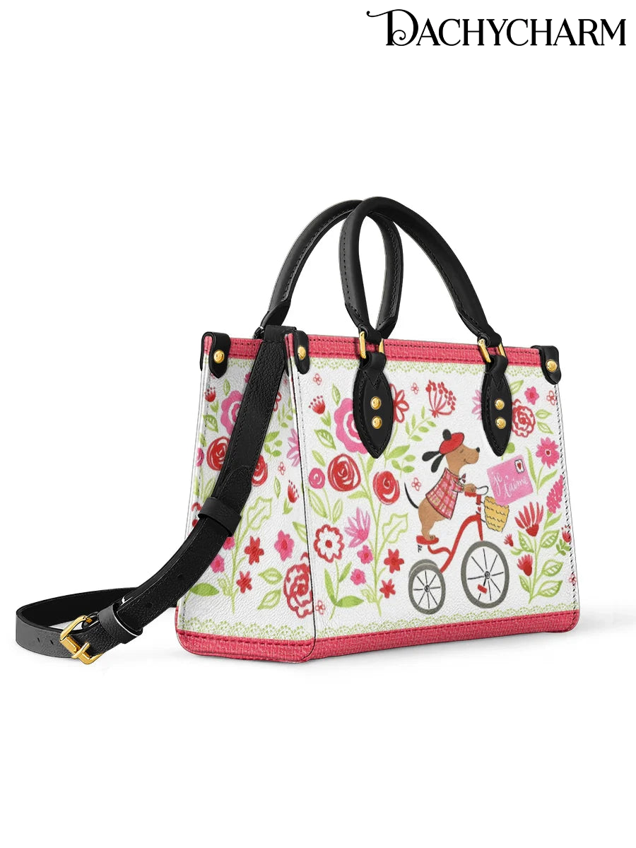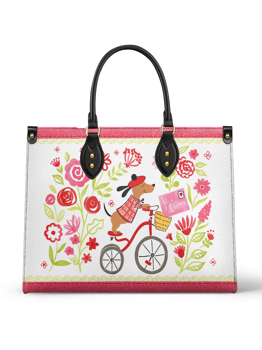 This sweet leather bag features a whimsical scene of a Dachshund riding a red bicycle through a blooming floral garden, delivering a letter that reads “Je t’aime.” With its hand-drawn charm, soft pinks, reds, and leafy greens, it feels like a page torn from a French storybook.