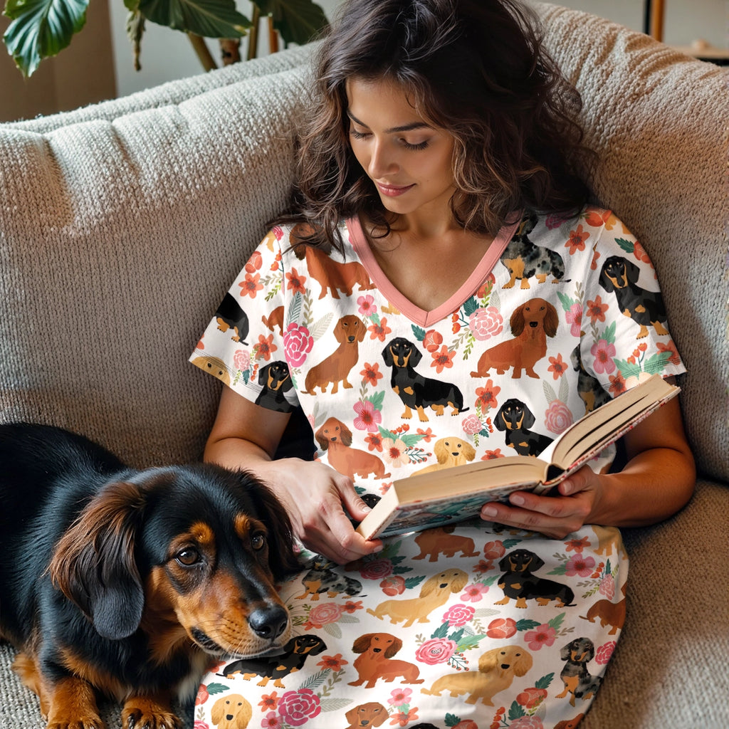 Drift into comfort with this graceful V-neck sleepwear, where elegant dachshunds bloom among watercolor florals, adding a tender charm to your bedtime look.