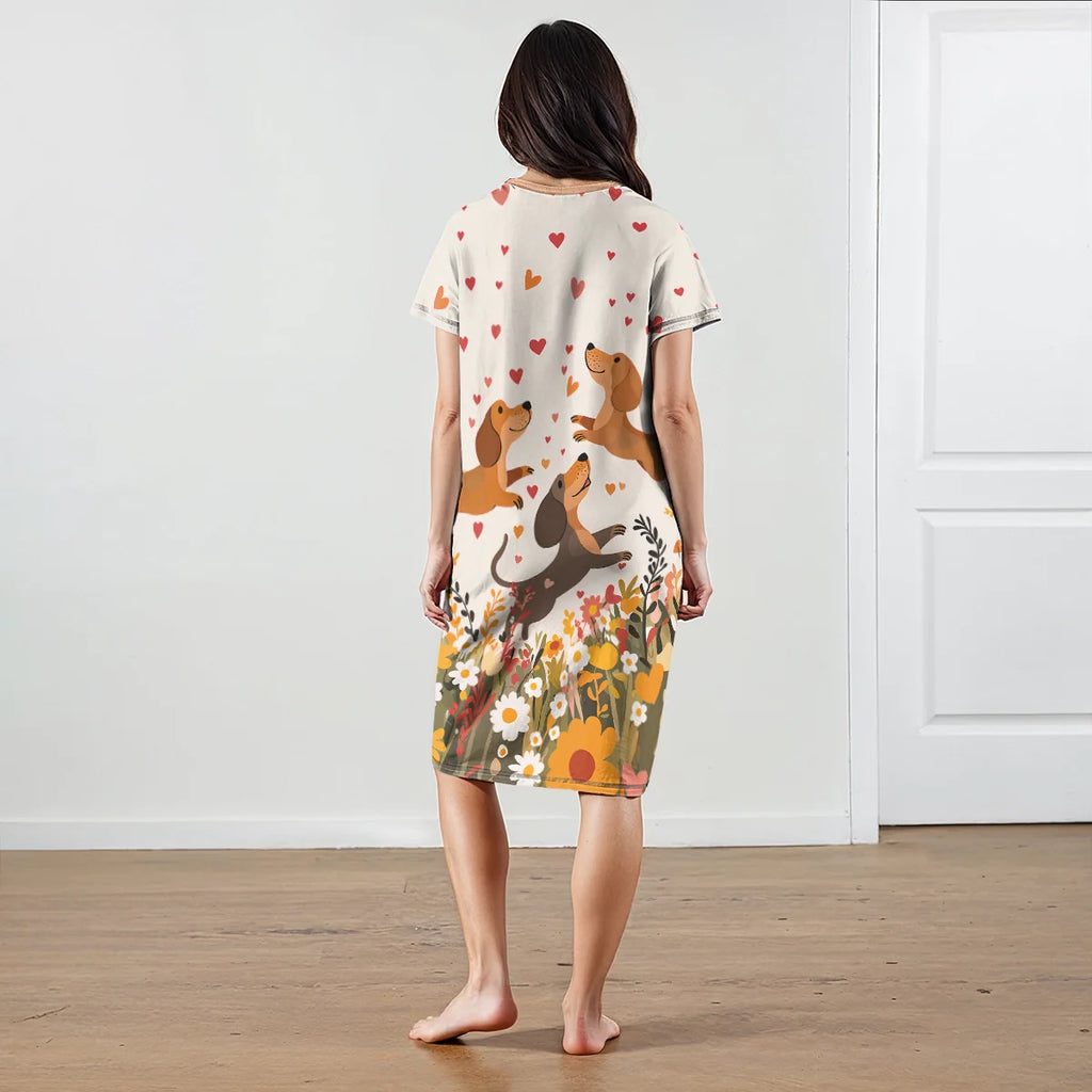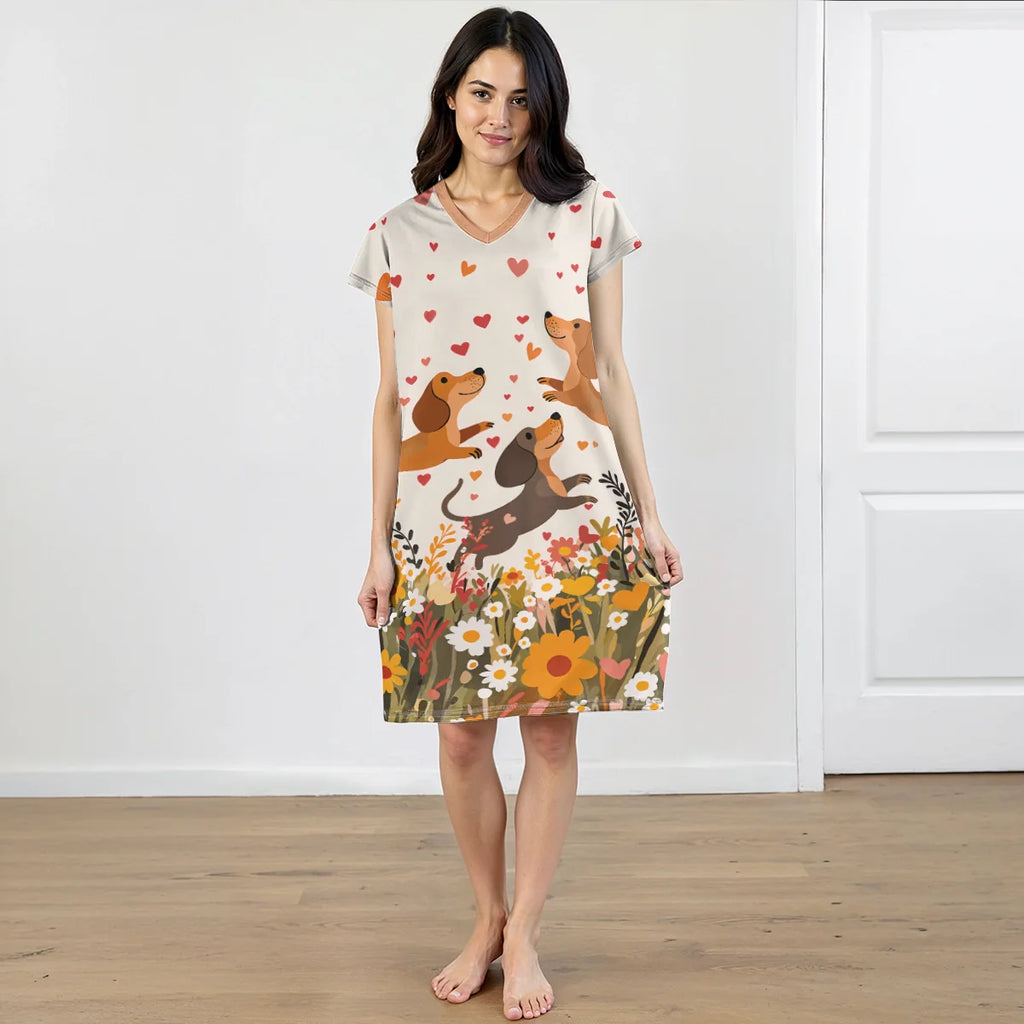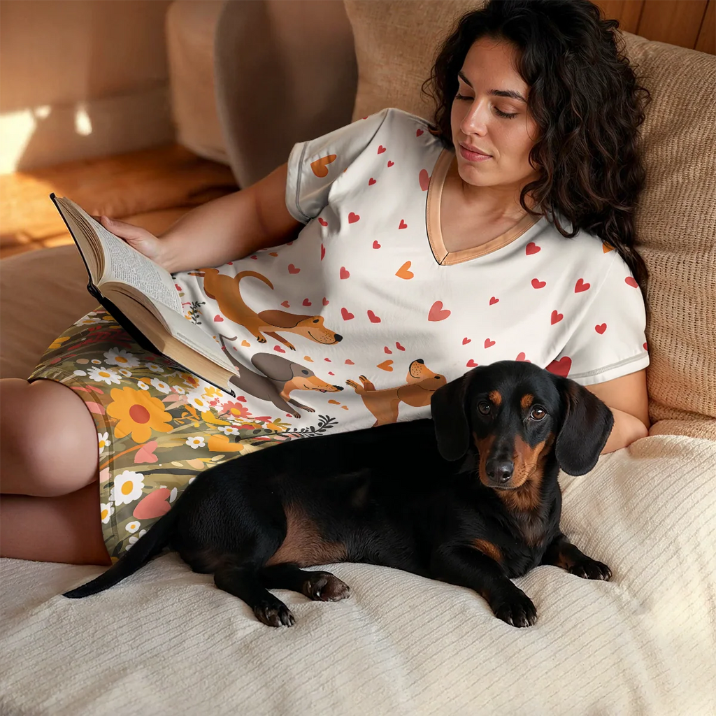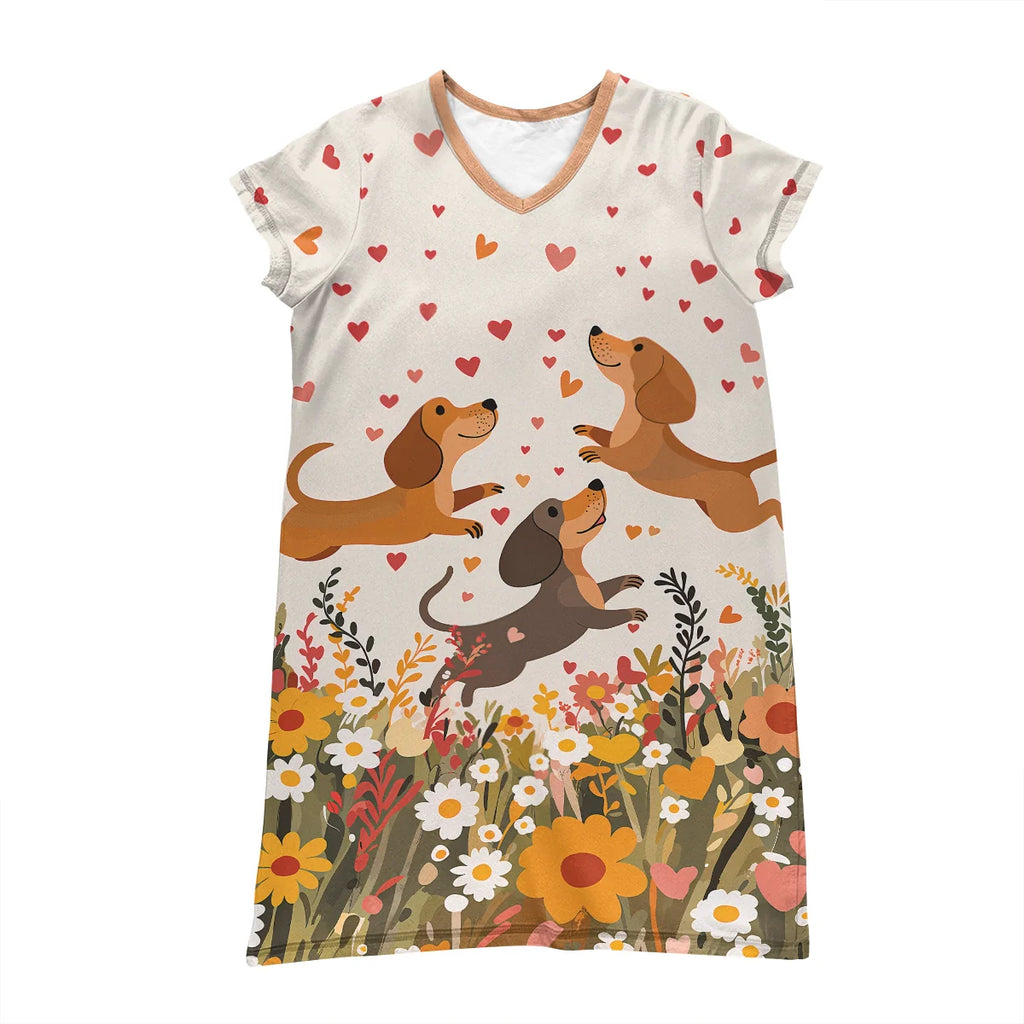 Drift into a dreamy night with this whimsical V-neck sleepwear, where joyful dachshunds leap through meadows of daisies and hearts, chasing love in every petal.