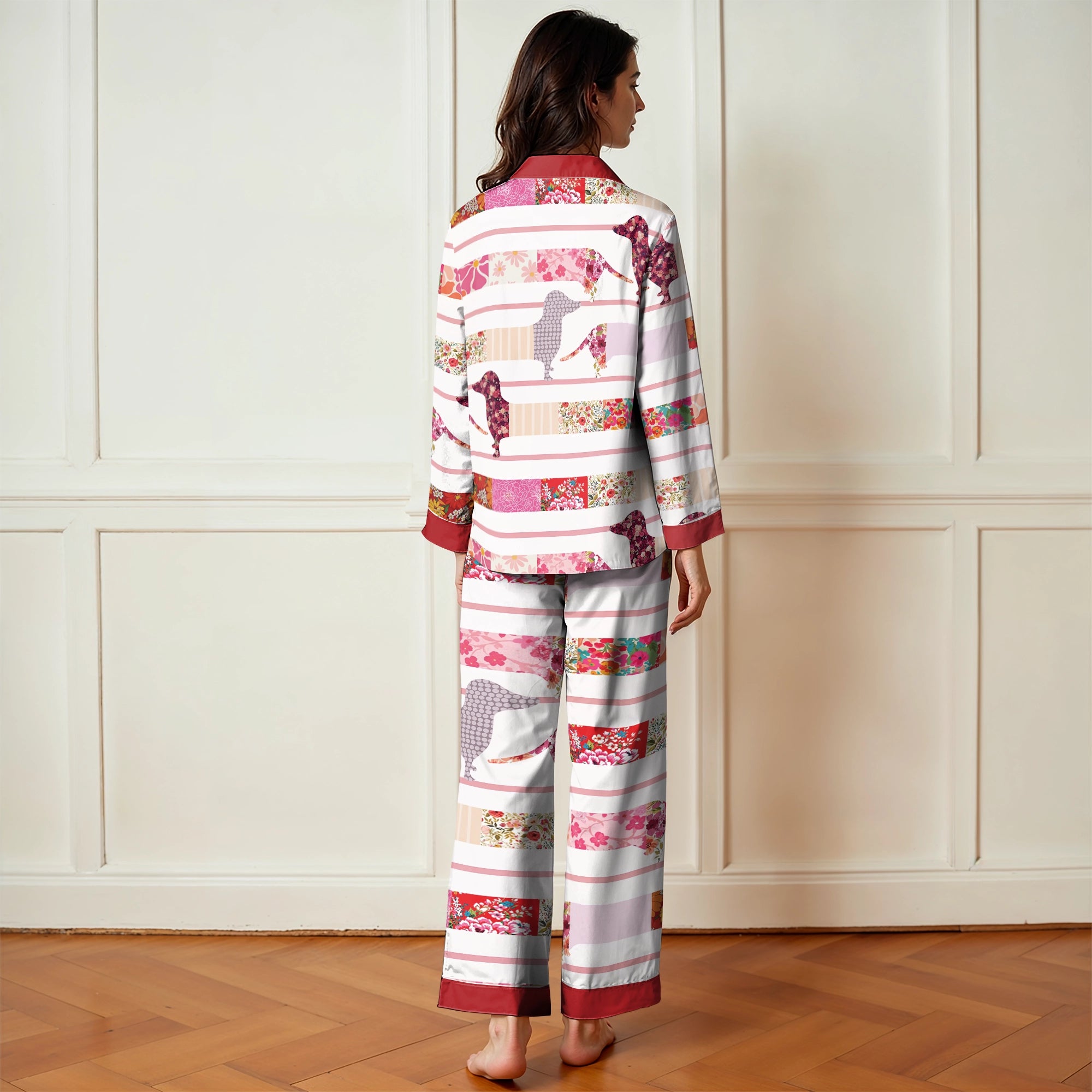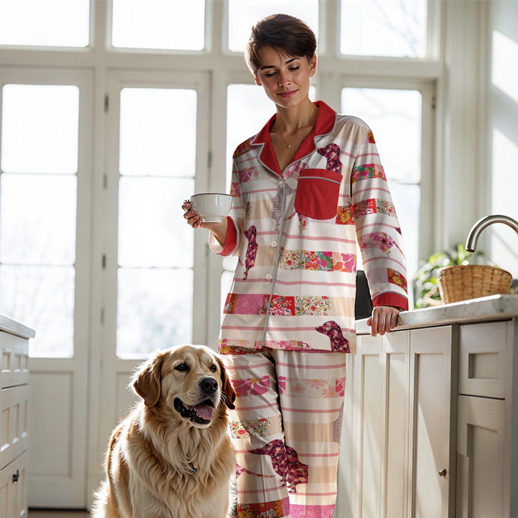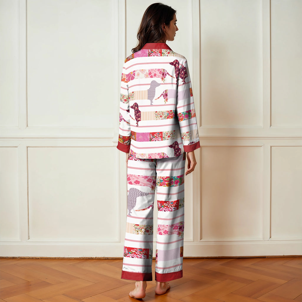 Wrap yourself in comfort with this cozy patchwork-style sleepwear, where dachshund silhouettes are gently nestled among strips of floral fabrics and soft pastel hues. This heartwarming pattern brings a vintage charm and evokes a feeling of warmth, nostalgia, and gentle joy. Made from soft, lightweight fabric, this is the perfect choice for anyone who loves dogs and timeless designโand wants to drift into dreams feeling wrapped in love and furry companionship.