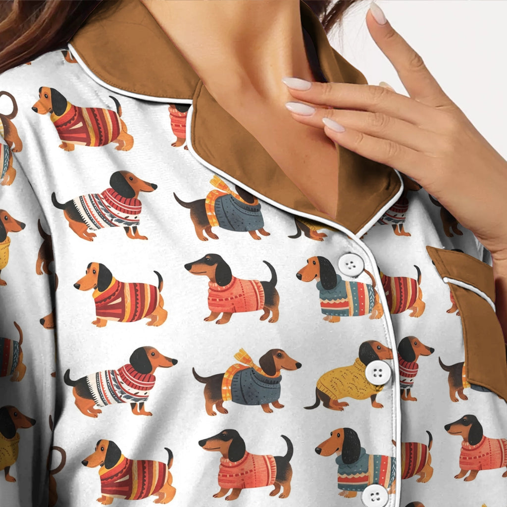 Wrap yourself in comfort with this whimsical sleepwear, where dachshunds dressed in colorful knitted sweaters parade across the fabric in joyful style. The playful pattern brings a sense of warmth and cheer, perfect for chilly nights or simply curling up with a book. Made from soft, lightweight fabric, this is the perfect choice for anyone who loves dogs and wants to feel connected to their furry friend even in their dreams.