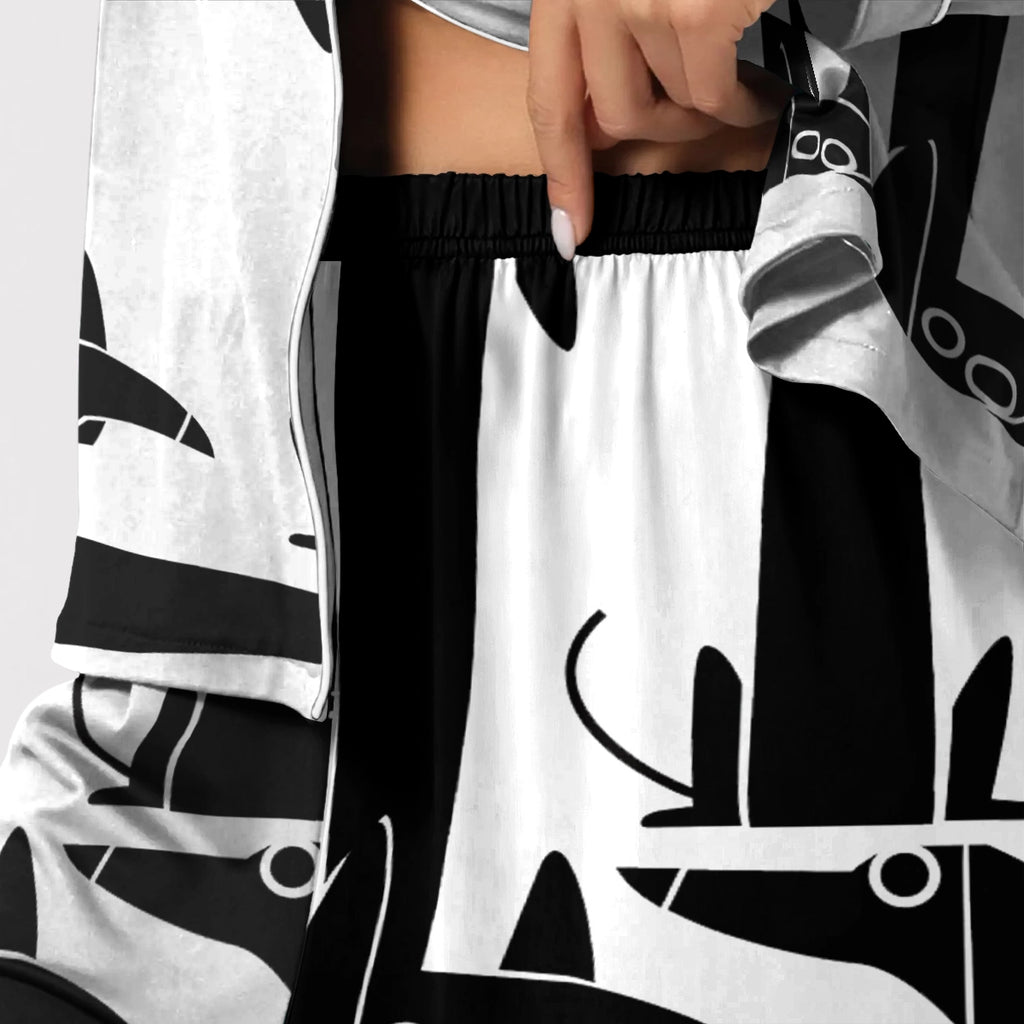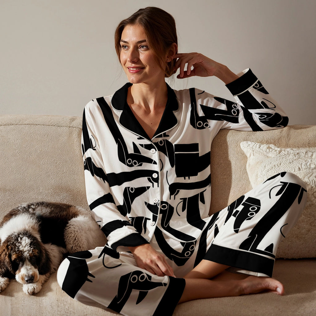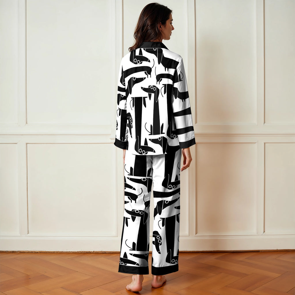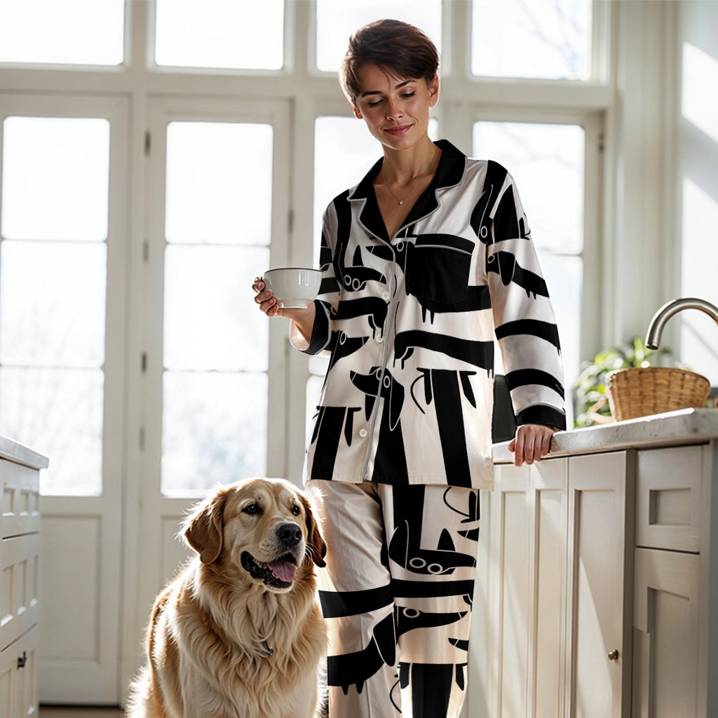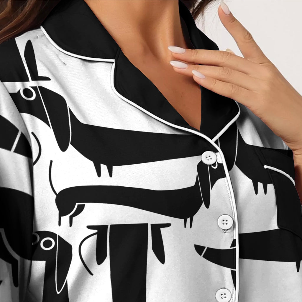 Wrap yourself in comfort with this modern graphic sleepwear, where bold black dachshund silhouettes stretch playfully across a crisp white background, creating a striking and contemporary pet-themed pattern. These quirky shapes not only add charm to your outfit but also bring a sense of fun, creativity, and bold expression. Made from soft, lightweight fabric, this is the perfect choice for anyone who loves dogs and wants to feel connected to their furry friend even in their dreams.