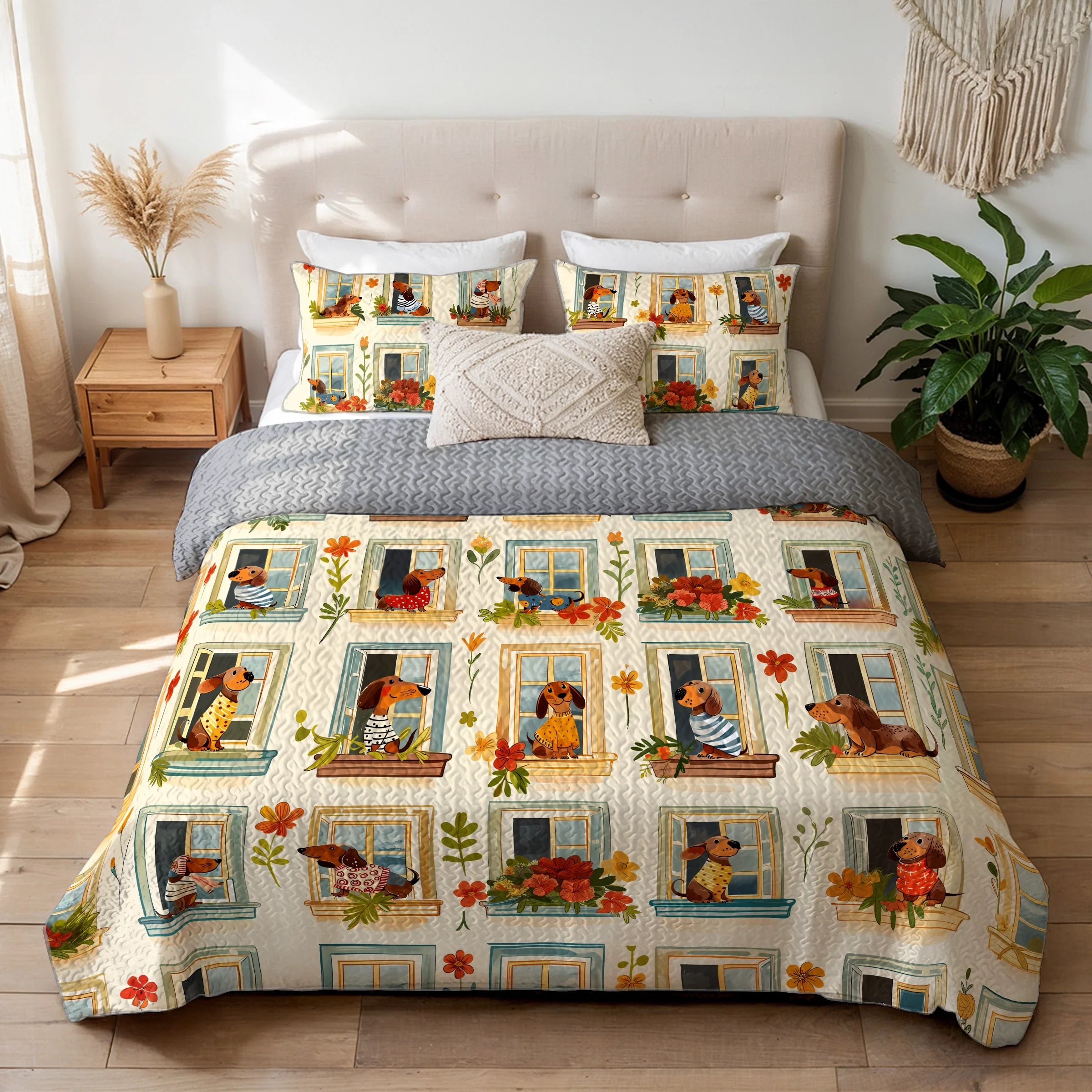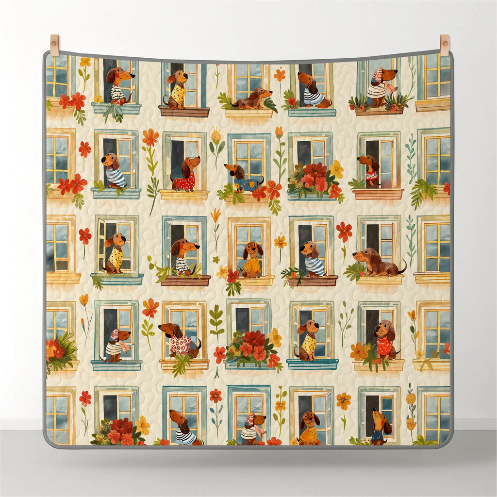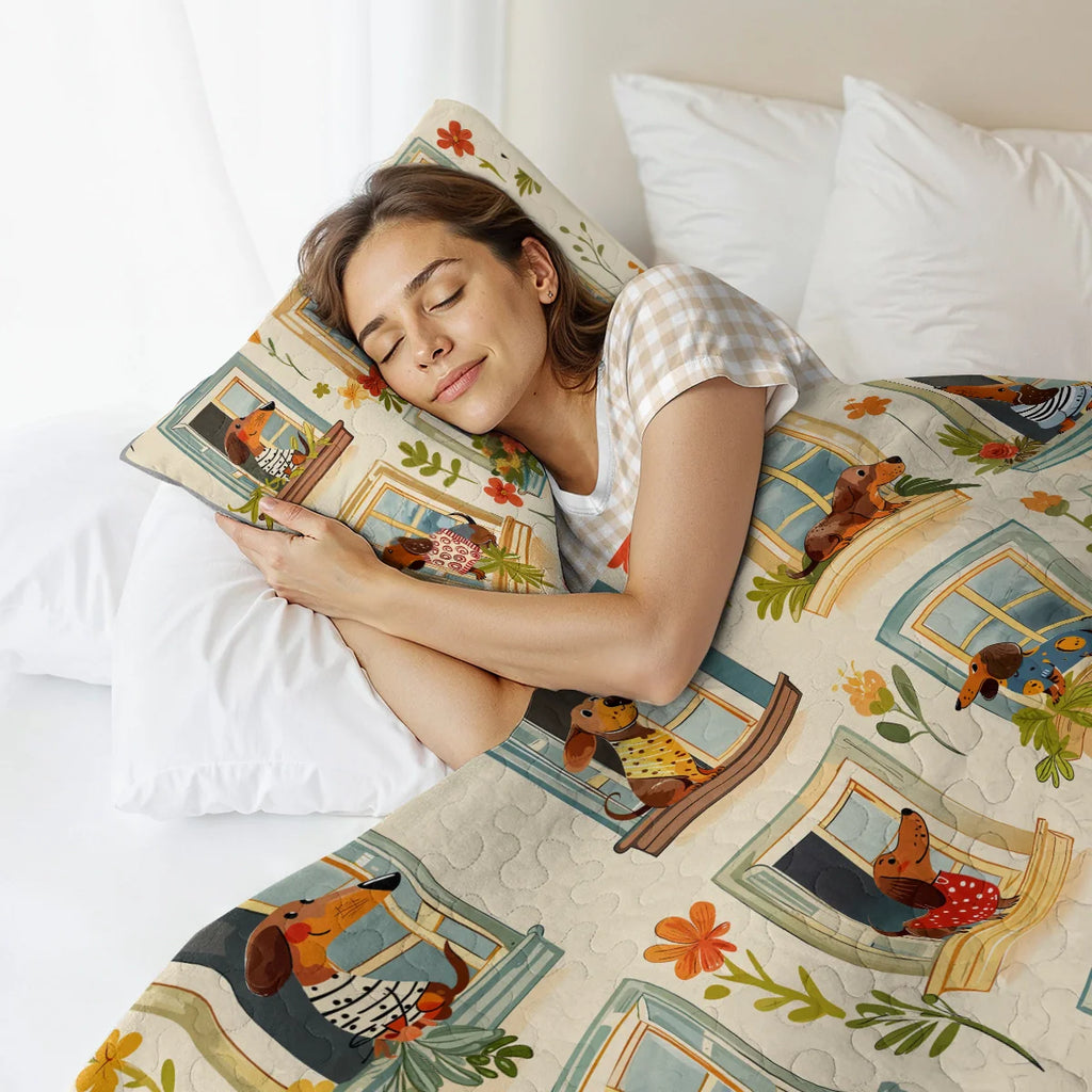Wrap yourself in comfort with this whimsical dachshund windowscape quilt set, where dachshunds peeking out from charming window frames adorned with potted flowers and pastel shutters with earthy beige tones, floral reds, leafy greens, and sky blue accents and playful dog poses and blooming windows not only add charm to your bedroom but also bring a sense of coziness, cheerfulness, and neighborhood charm. Made from soft, lightweight fabric, this is the perfect choice for anyone who loves dachshunds and wants to feel connected to their furry friend even in their dreams.
