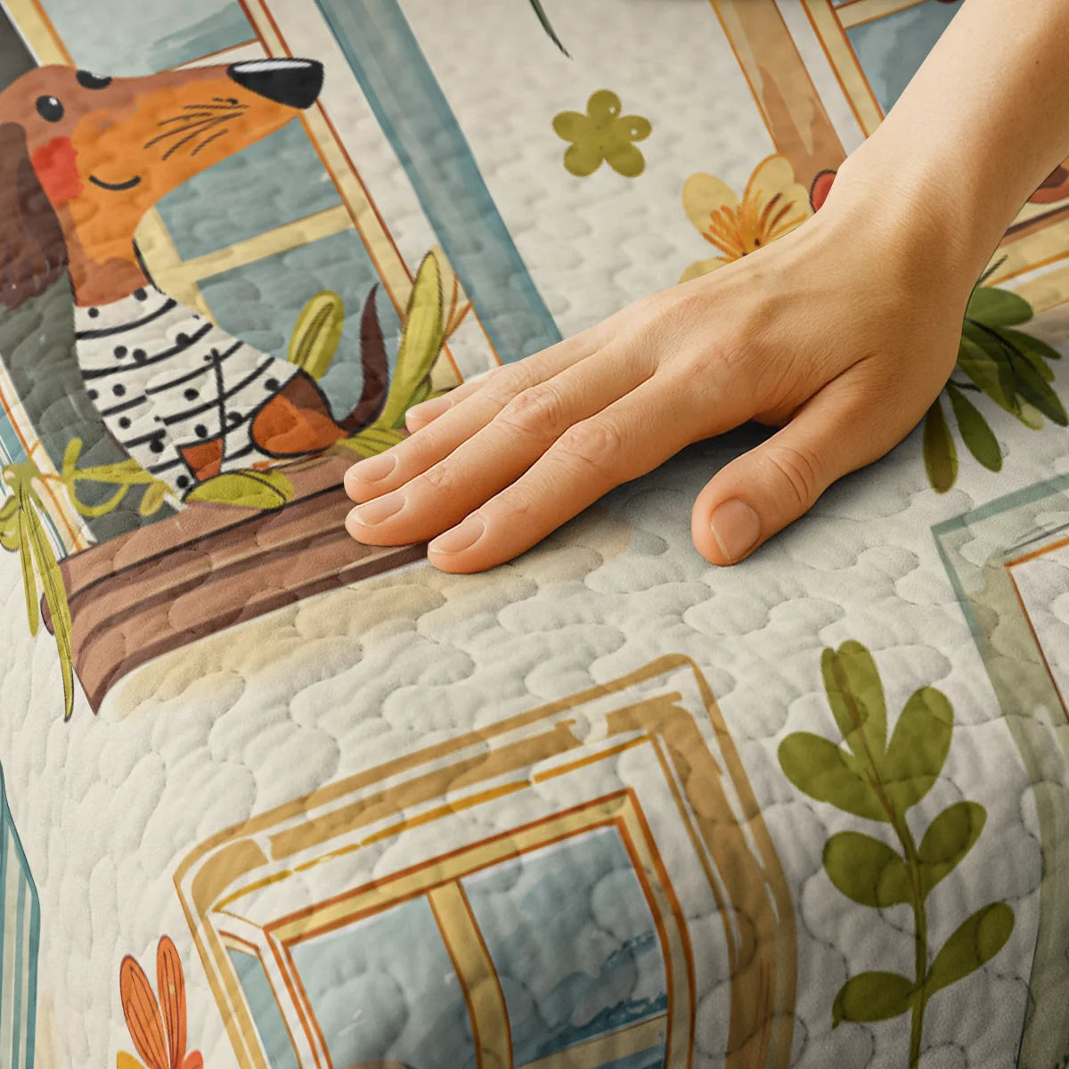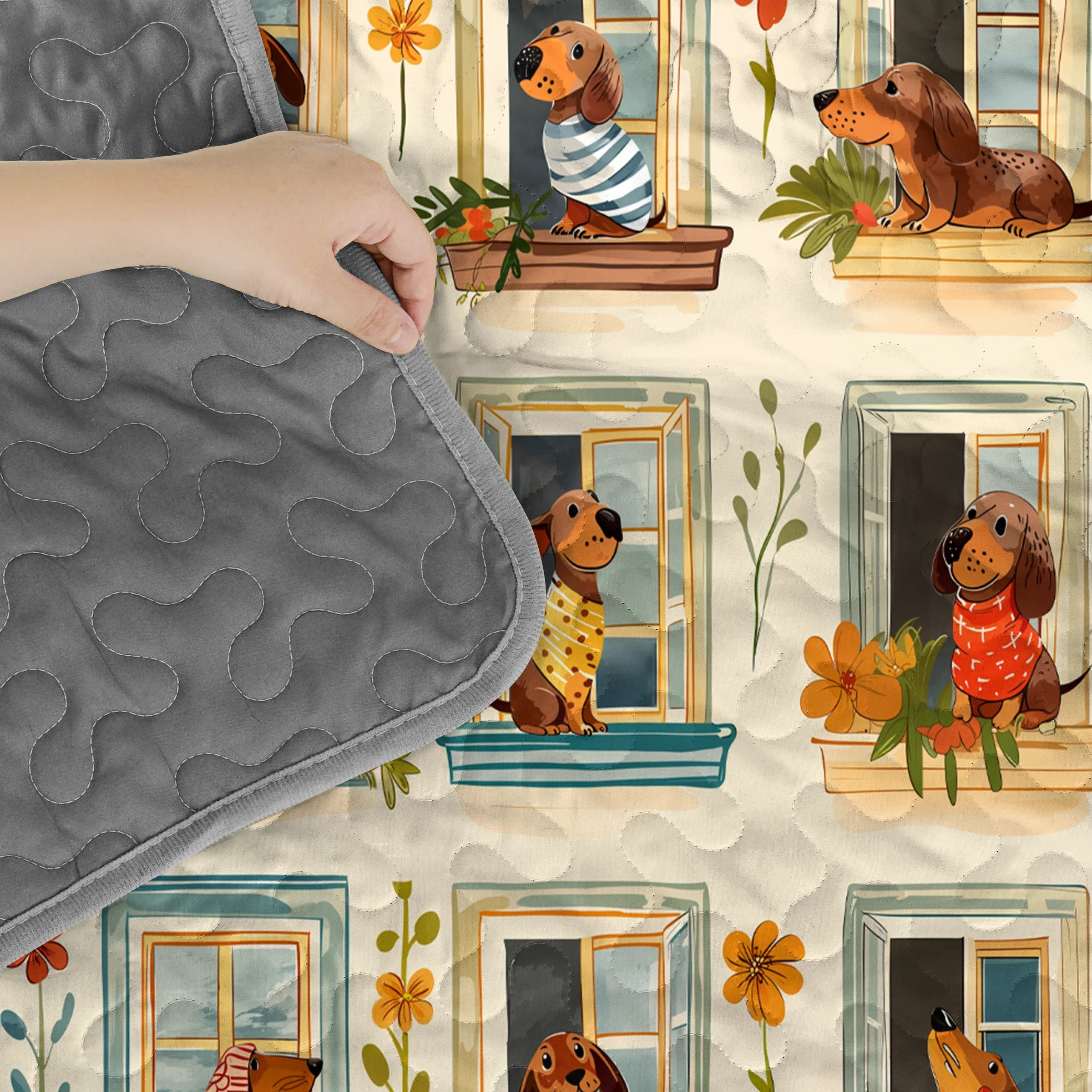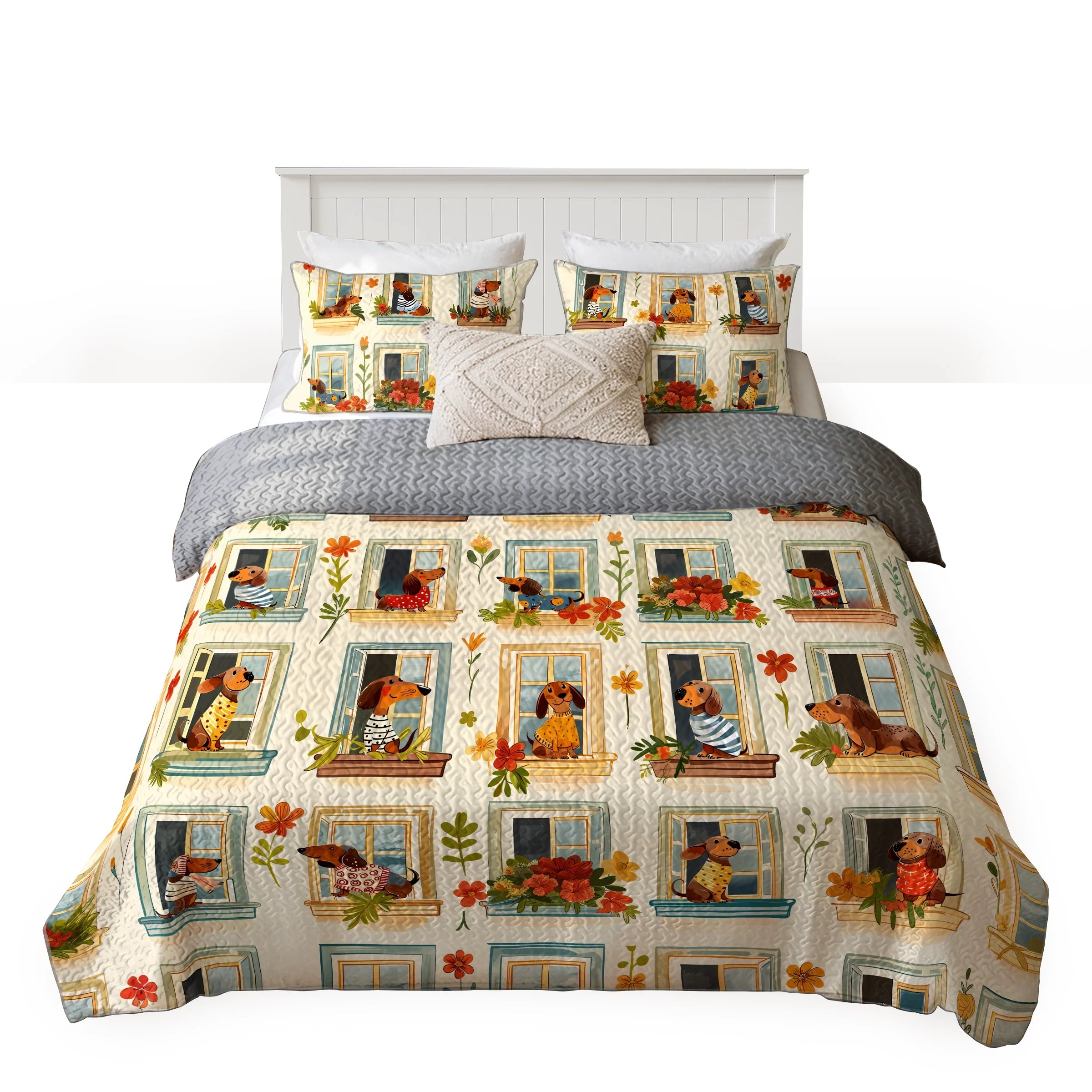 Wrap yourself in comfort with this whimsical dachshund windowscape quilt set, where dachshunds peeking out from charming window frames adorned with potted flowers and pastel shutters with earthy beige tones, floral reds, leafy greens, and sky blue accents and playful dog poses and blooming windows not only add charm to your bedroom but also bring a sense of coziness, cheerfulness, and neighborhood charm. Made from soft, lightweight fabric, this is the perfect choice for anyone who loves dachshunds and wants to feel connected to their furry friend even in their dreams.